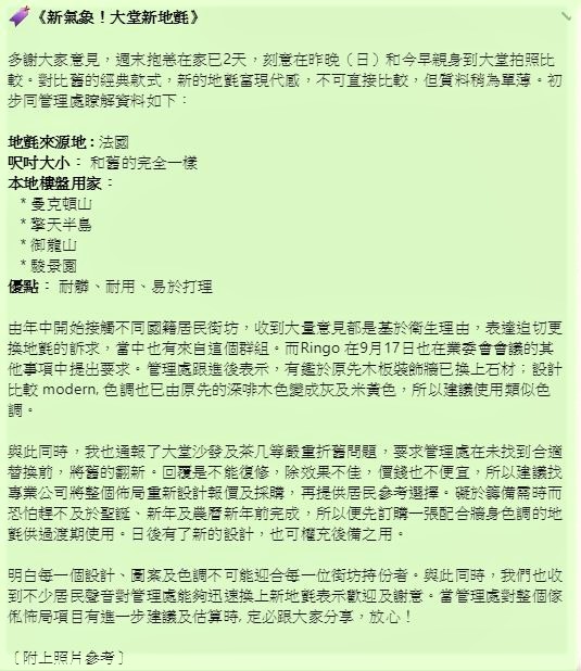 大家好!上週我正值外遊渡假,不在香港。看到有鄰居朋友在個別屋苑群組熱議選購大堂地氈一事,分別對款式挑選及其過程表達了意見。現以業委會主席個人身份回應,希望釋除大家誤解。如仍有疑問,歡迎大家私訊另約時間討論。