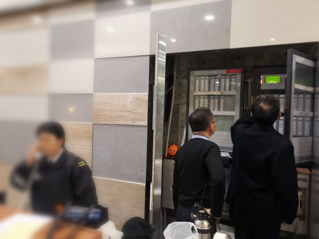 到達時大堂已聚集了一群一臉惶恐又睡眼惺忪的住客,大家不約而同的盯着正在忙於檢查消防系統控制板面的管理員並追問在哪裡出現狀況。管理員表示正在設法把警鐘按停但不果,可是當刻大家比較關心的,相信還是能否確定事故源頭、警鐘是否誤鳴及危機是否已真正解除等等。之後,在另一位業主的催促下,管理員和我們一同走上了涉嫌觸發警鐘的樓層檢查,發覺一切正常,沒有可疑。可是火警鐘一直嚮過不停,直到當值客服主管出現,才把警報系統重置,回復平靜。事後主管亦和我們一同巡查了隔火層,確認現場不是觸發火警鐘的源頭才收隊。