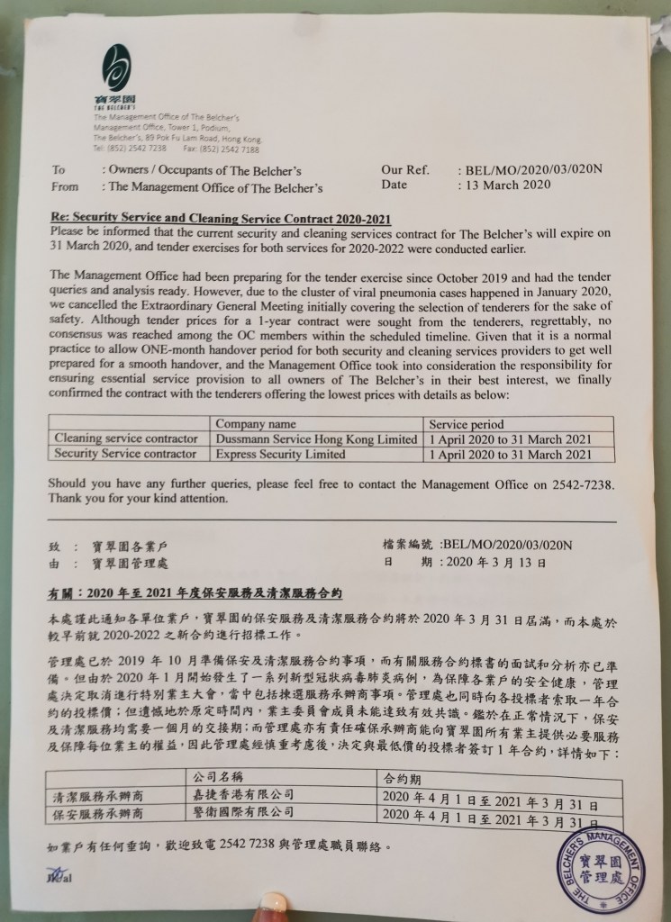 不知各住户有否留意,上週五(3月13日)傍晚時份,管理處已俏俏的在座頭報告板上貼出通告,通知各業主及住客「由於業主委員會成員未能達致有效共識…,因此管理處決定與最低價的投標者簽訂了1年合約,分别為嘉捷香港(清潔)及警衛國際(保安)並於4月1日開始生效」,詳見下圖: