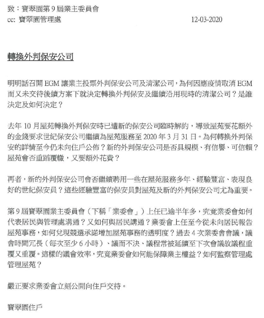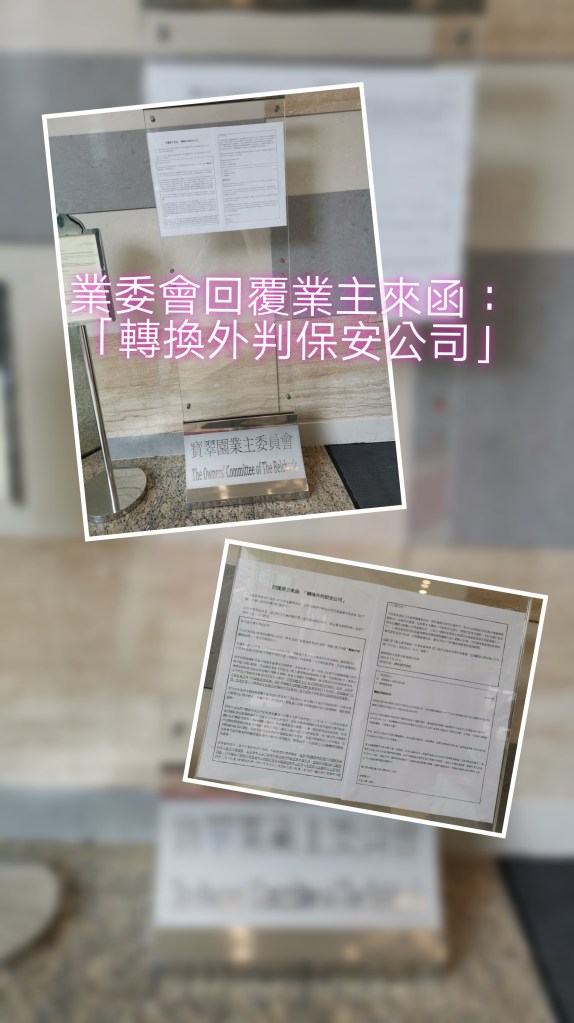 第9屆業委會近日收到13位業主聯署來信,提問有關更換保安公司及會議運作等事宜 (見下圖),本會已就查詢事項回覆如下。