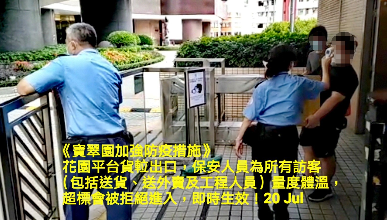經過內部溝通及人手調配,除填寫健康申報及留下聯絡資料等措施未能實施外,管理處已於今晨(20/7)開始要求訪客在屋苑公眾地方範圍內必需戴上口罩,及即時在下列4個主要入囗為訪客量度體溫,如發現溫度超過攝氏37.4度,訪客便會被要求離開,不得進入!