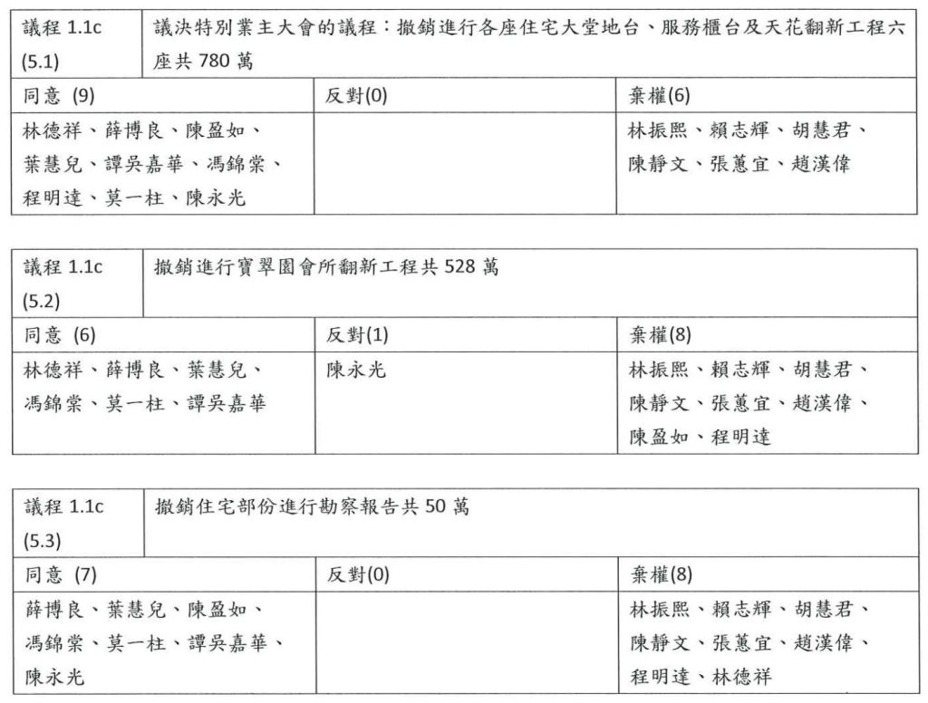 議決及通過住宅部份任何維修工程金額達50萬元或以上,業主委員會應優先考慮使用「招標妥」。以下是當天投票結果,因此絕不存在兩位委員所述的「因被鎖事打擾及拉布,而引致招標妥未能擺上議程」的情況!