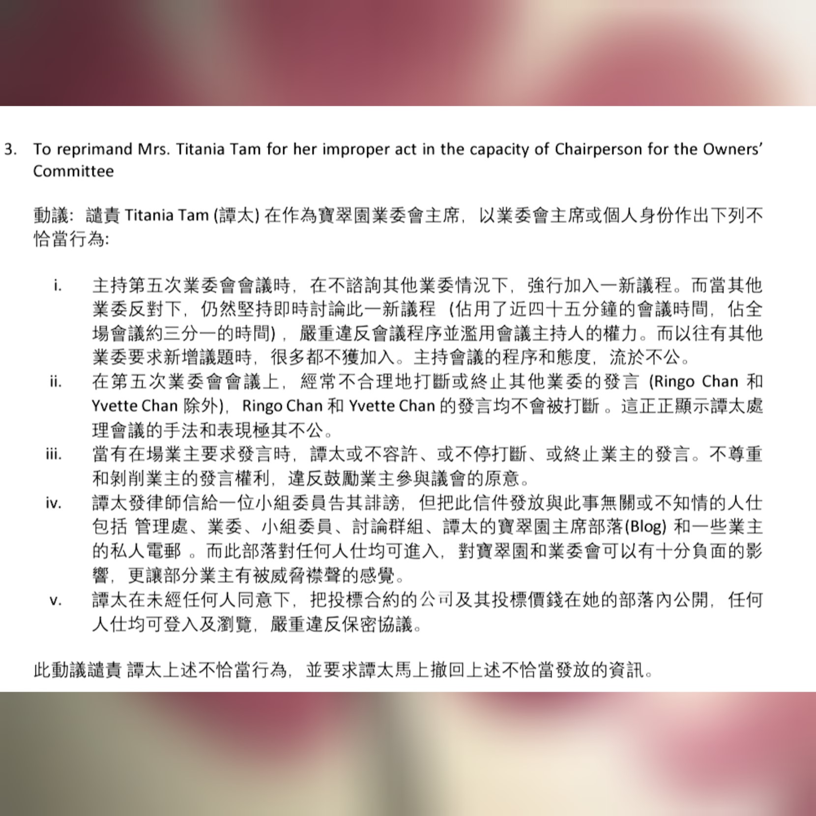 對於薜、莫兩位委員動議譴責本人Titania Tam (譚太) 在作為寶翠園業委會主席,以業委會主席或個人身份作出一列不恰當行為的指控內容如果屬實,本人無懼接受批評。否則兩位委員便應馬上撤回指控並向本人道歉!以下是有關指控及我的回應: