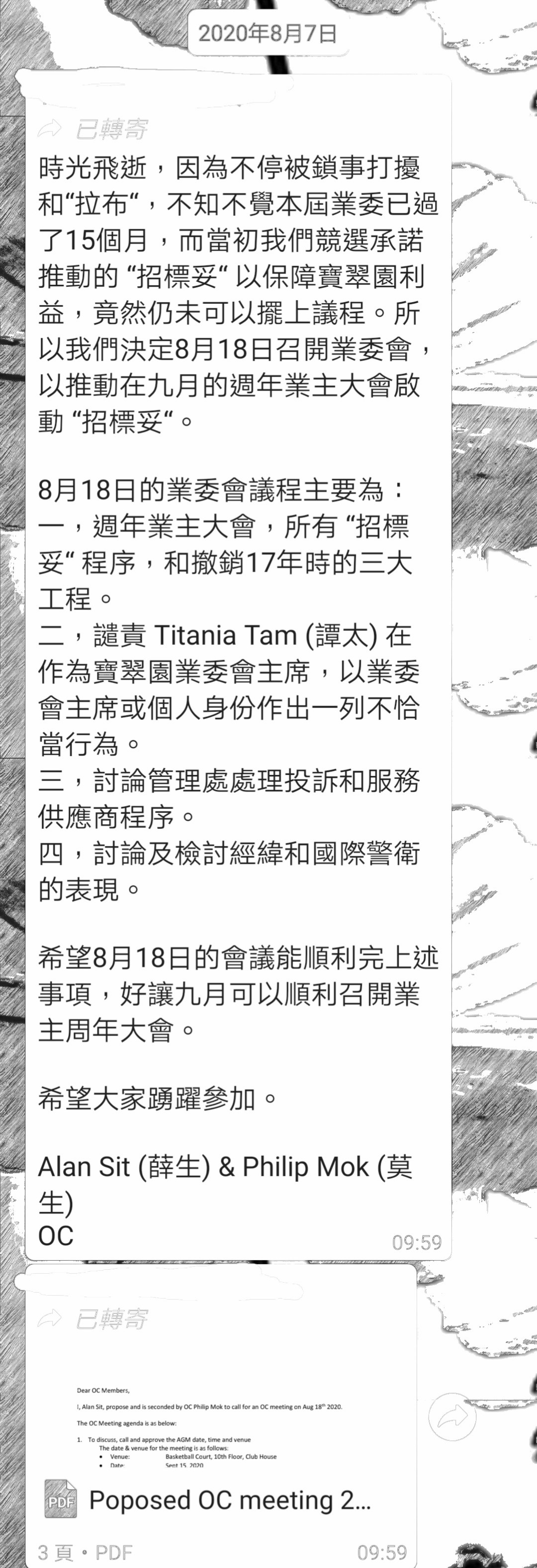 就8月7日由兩位委員Alan Sit薛博良及Philip Mok莫一柱單方面向屋苑內由某組織發起的多個WhatsApp群組同步發放他們向管理處要求在8月18日召開業主委員會會議的訊息,並邀請業主踴躍出席一事,本人不但不敢苟同,亦認為在疫情久久不下的情況下,兩位仍作出該項呼籲是極不負責的行為!再加上議程大部份內容明顯是衝著數落本人當主席一職的不是,既然兩位委員捨棄以對話方式來解決問題,而選擇使用群眾壓力,我也希望兩位能夠有勇氣及承擔,將我的聲明原文也一字不漏的轉載到他們原先發放訊息的群組裏去,否則這便是刻意剝削居民的知情權,營造主席處事不公,損害居民利益的假象,以達致他們背後之目的。