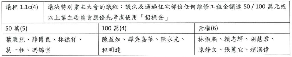 另外在第4次的業委會會議上(即今年的1月10日),議程第一項就是討論「2020周年業主大會日期、議程及相開安排事宜」並通過2月19日為會期(後來因新冠肺炎關係而取消)。席間莫一柱委員即塲要求將「招標妥」放上週年大會議程,並獲得全數9位住宅部委員支持及以5票對4票的比數,將適用工程金額下限定為50萬元,但由於莫委員在會前並沒有知會作為會議主持的本人,又對議題缺乏準備,因此即塲花了不少時間咬文嚼字去研究精準文字內容,最終通過決定將以下議程納入業主周年大會內: