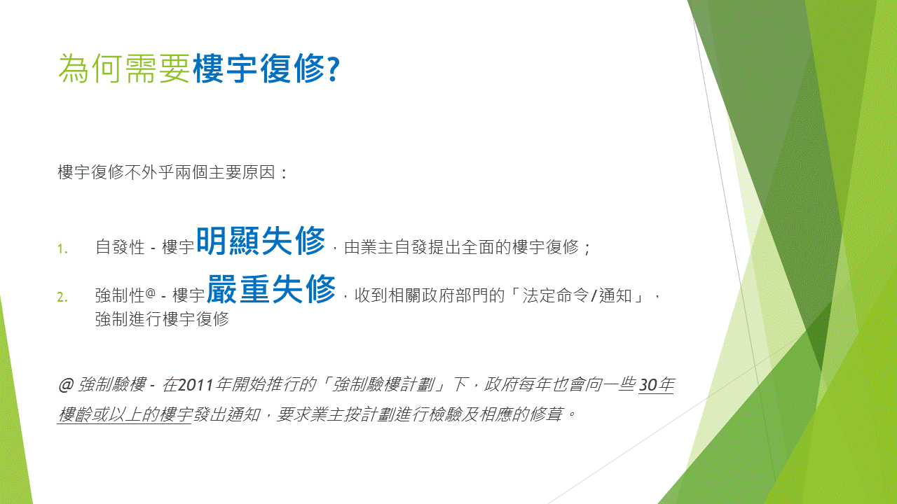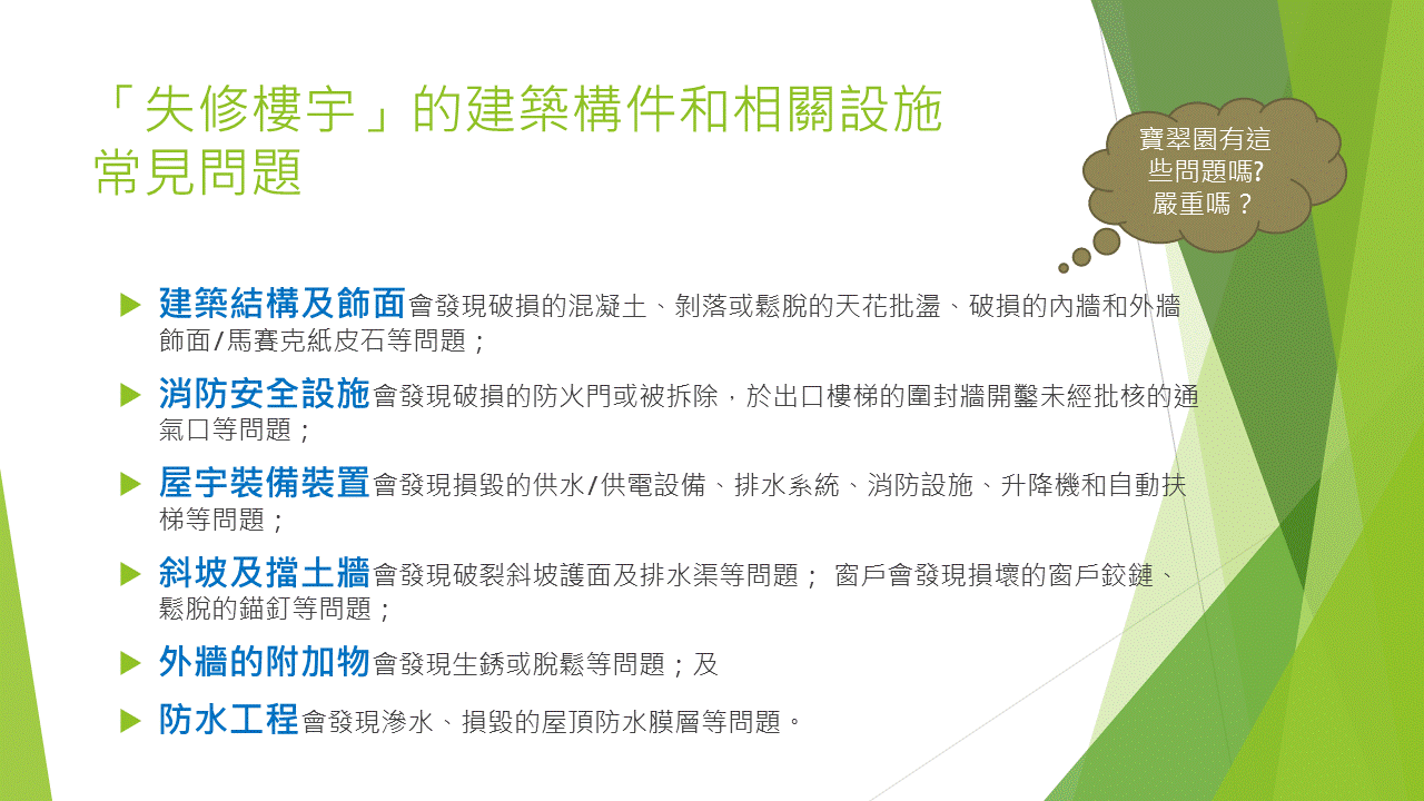 答:主席譚太在8月中加入業委會轄下成立嘅「工程及維修小組」後,已要求下次小組會議上與管理處共同檢視屋苑嘅「五年大型維修計劃」,嚐試從中按工程緩急先後而排序。取得初步建議後再交上大會討論及審議。以下是樓宇復修嘅六個步驟: