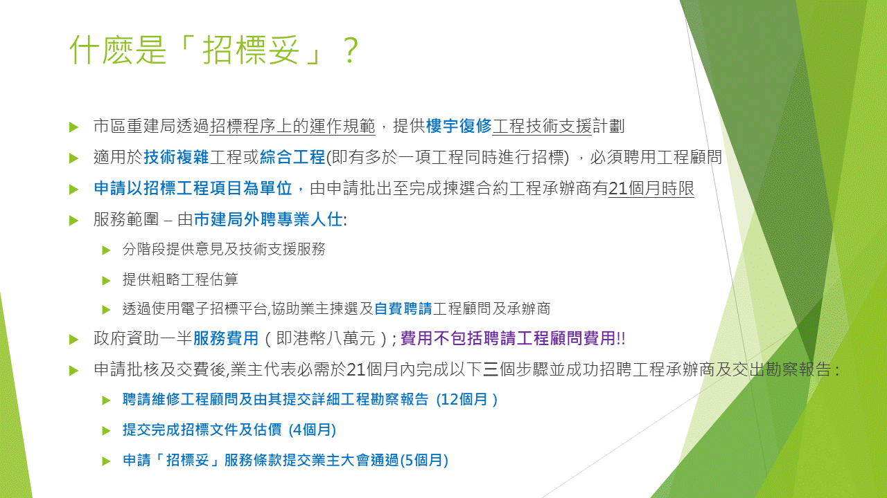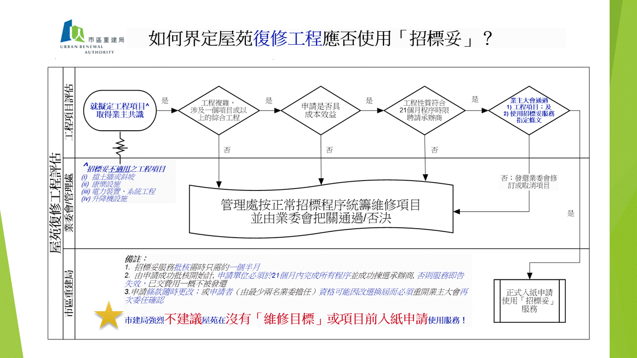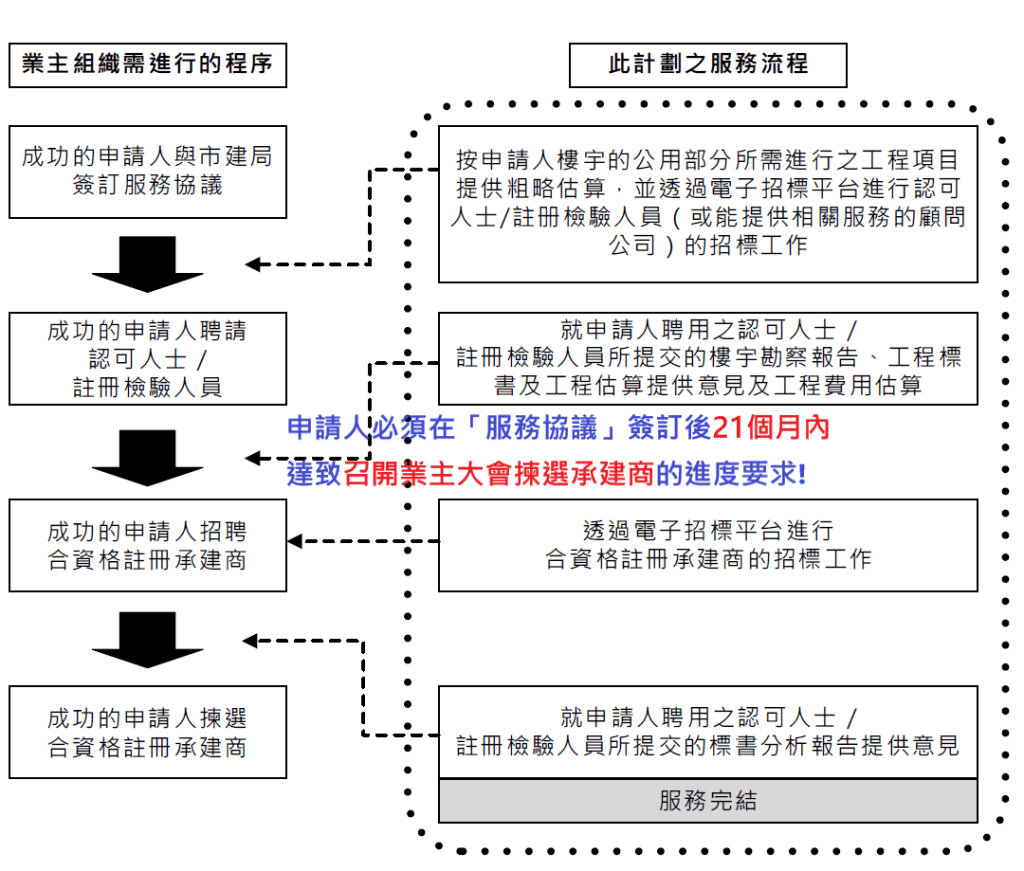 而合約條款所指需要喺21個月內完成「招標妥」嘅流程,即成功開到業主大會揀選合資格承辦商呢一步,就由申請批核,成功交費一刻開始計算。喺冇討論,冇共識,冇復修目標嘅情況下,呢個絕對係一個挑戰!所以巿建局都強烈唔建議屋苑喺冇具體維修目標,工程項目又未經業主大會同意前,先行通過申請「招標妥」服務㗎!