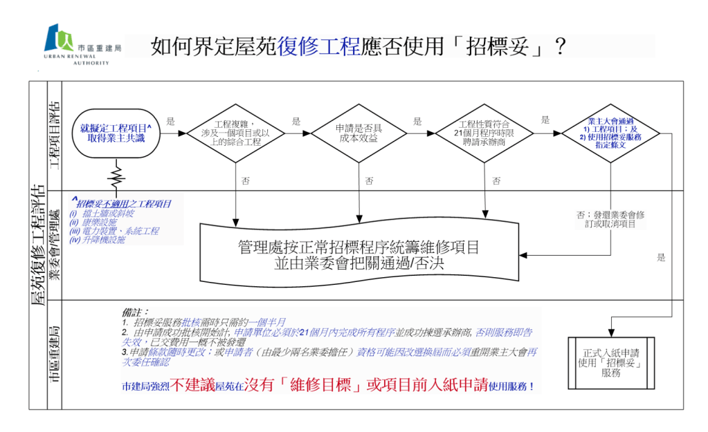 答:「招標妥」只係巿建局「樓宇復修綜合支援計劃」一籃子項目中的一個資助業主組織服務,毋須經過差餉租值審查,覆蓋全港大小私人樓宇,樓高3層或以下的樓宇或新界豁免管制屋宇則除外。
