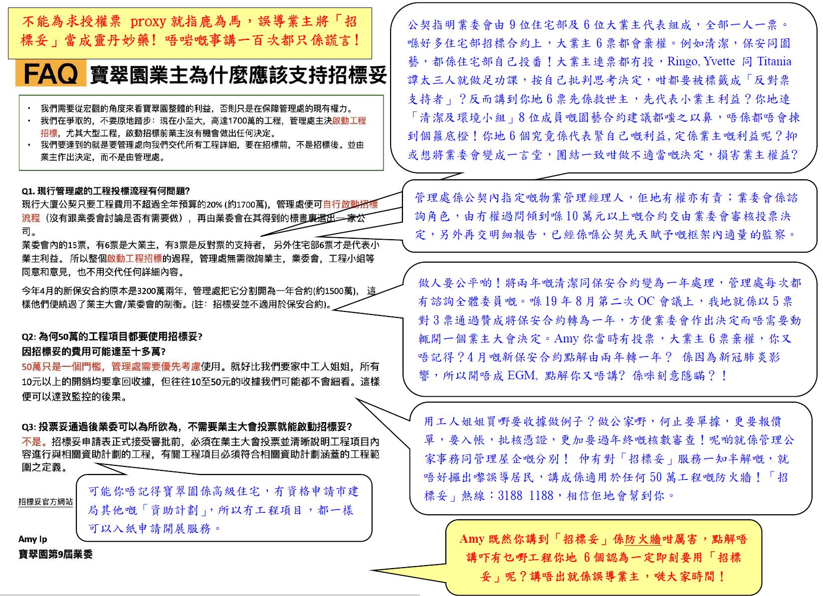 15th 九月 202016th 九月 2020titaniatam在 是其是,非其非 發表留言 是其是,非其非 各人觀點不同。Amy Ip 葉慧兒委員在屋苑推動宣傳「招標妥」本應無可厚非。可是面對宣傳單張內容失實陳述,本人作為業主、委員及主席的三重身份,更是責無旁貸,理應挺身而出講清講楚,幫助大家明辨是非!如有查詢歡迎業主鄰居直接留言聯繫。 清晰 pdf版Download 分享此文: 分享到 X(在新視窗中開啟) X 分享到 Facebook(在新視窗中開啟) Facebook 喜歡 正在載入... 相關