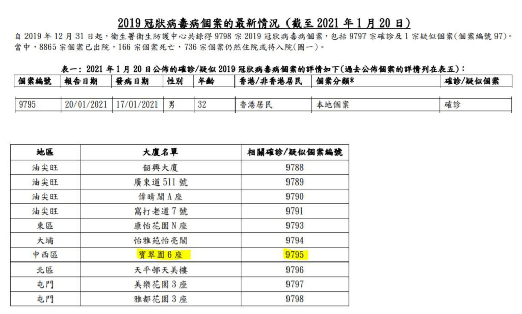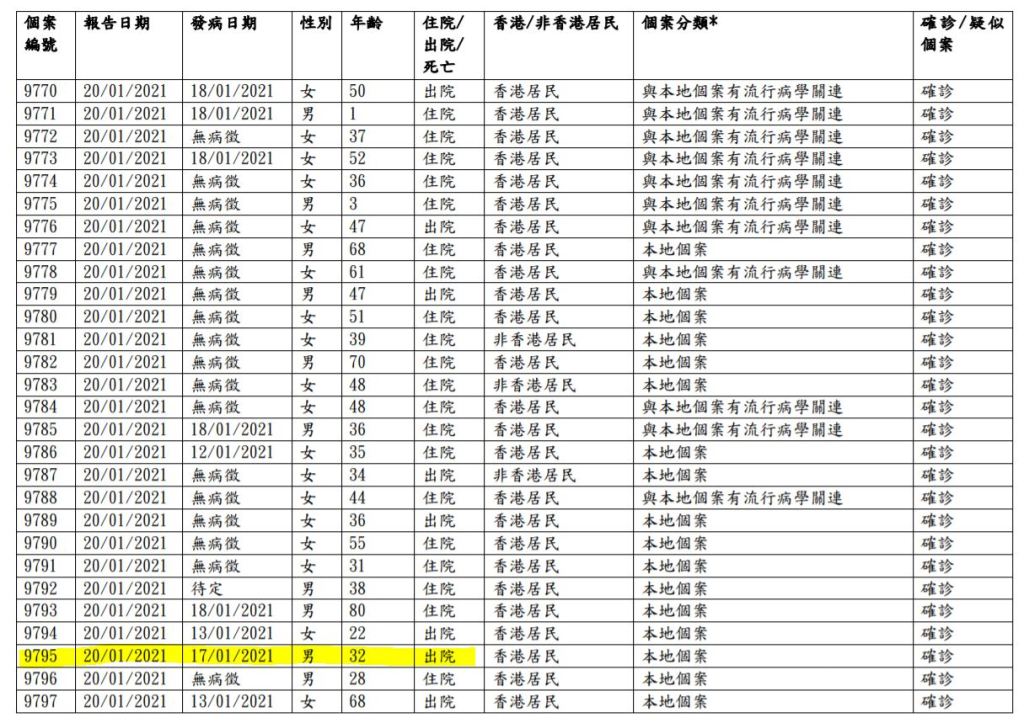 資料補充: 根據衛生防護中心最新資料顯示, 該確診個案編號為9795。