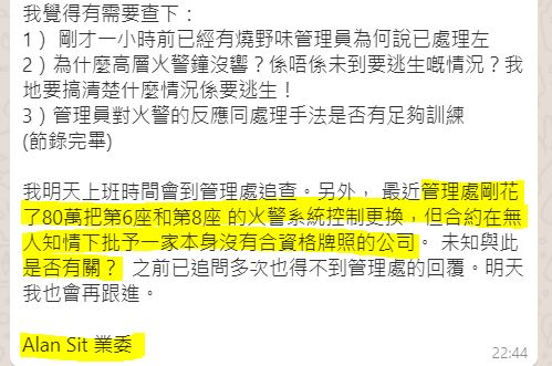 就事件,Ringo, Yvette 及我也根據現場搜集信息及鄰居事後提供線索,向管理處提出了一連串居民感到憂慮及疑惑的問題。原文連結在此:緊急跟進第八座火警意外相關安全問題