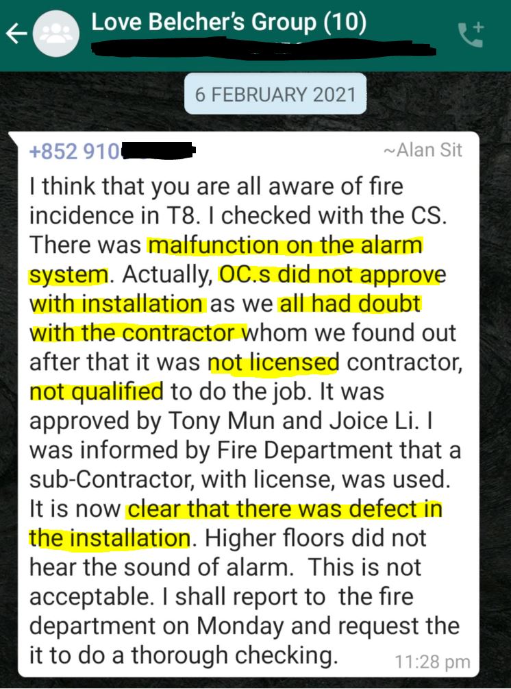 此外事隔一天, 昨晚(2月7日)我亦開始陸續收到鄰居轉發由薜委員 Alan Sit 透過「愛 XX 關注組」的具名訊息,當中除節錄引述其中一位住戶在「Ringo資訊站」居民群組提出的疑問外,並加上以下不盡不實之言論: