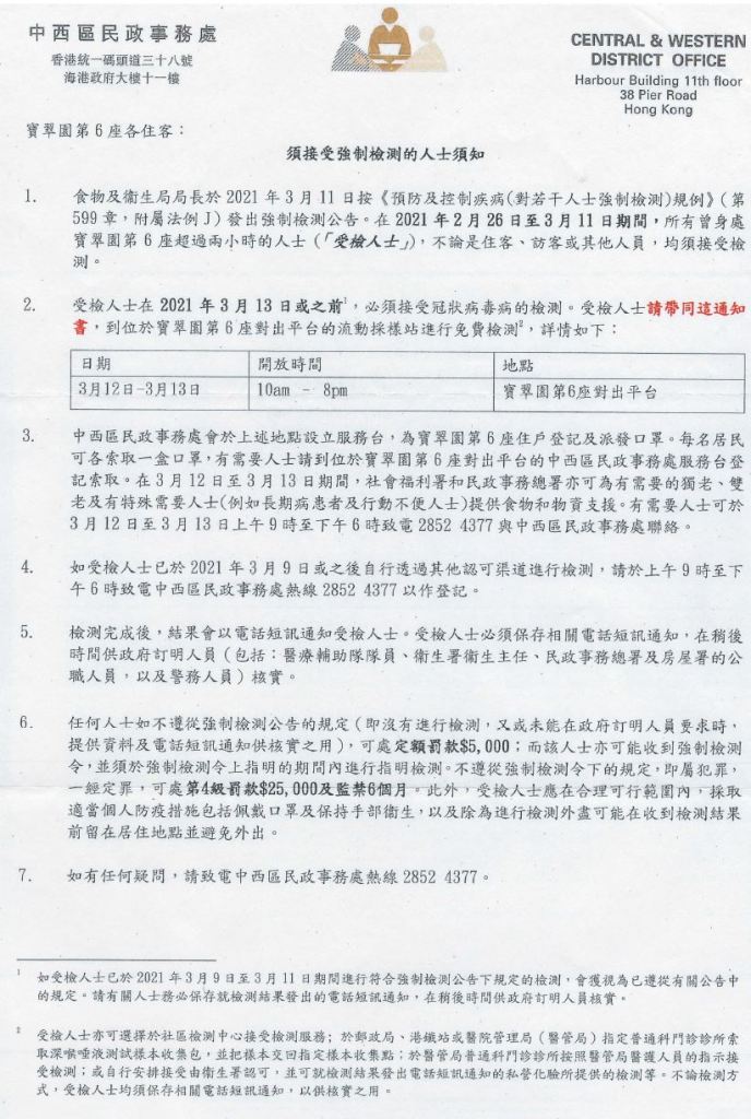 繼管理處於今天較早前發出通告(通告按此連結)通知住戶第六座有居民確診 (個案編號 11150),預計政府將於今晚稍後時間引用《預防及控制疾病(對若干人士強制檢測)規例》(第599J章),就強制檢測公告刊憲,要求本屋苑第六座所有居民於3月13日本週六前, 接受2019冠狀病毒病核酸檢測。