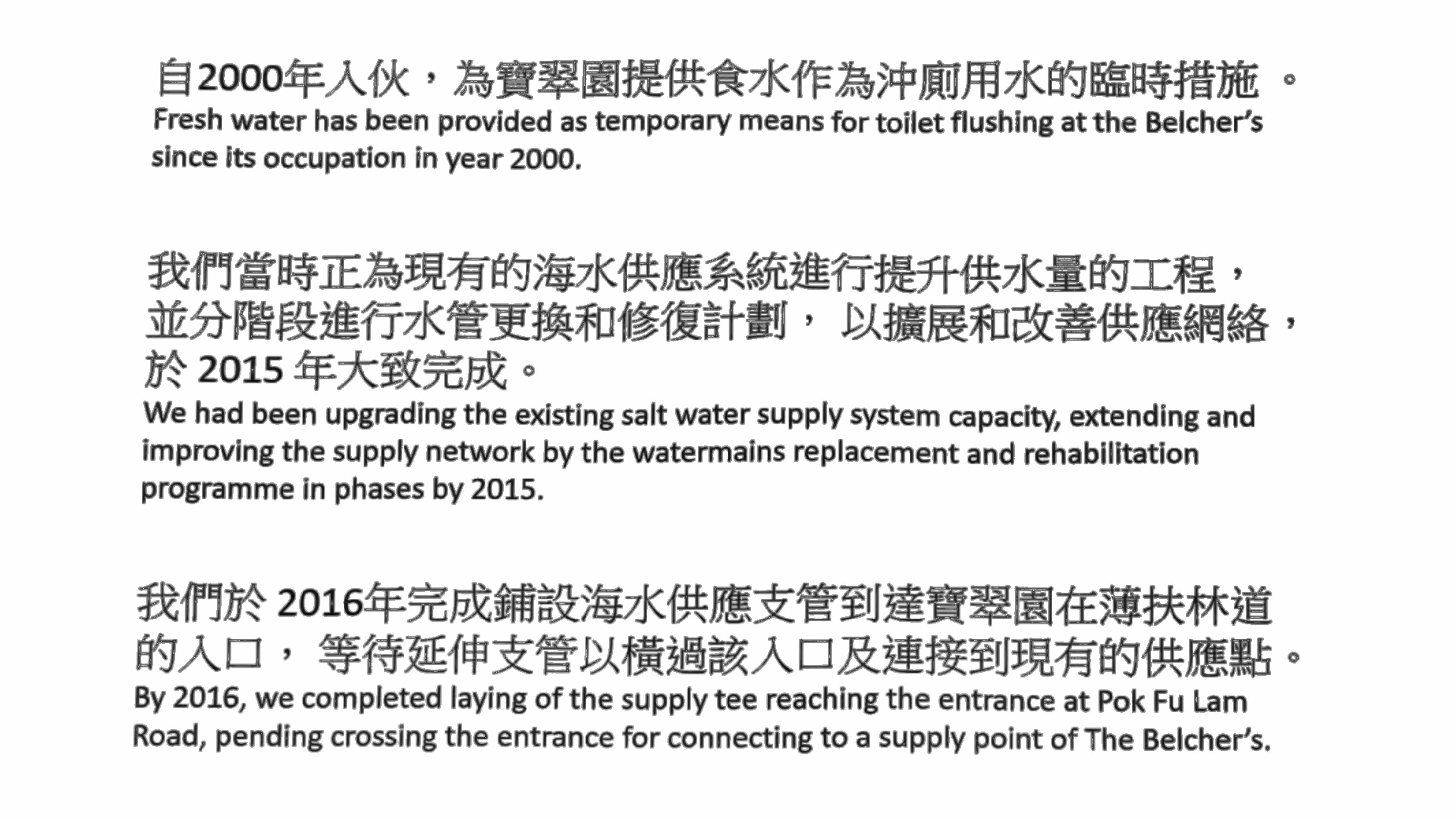 答: 寶翠園早於建築時期已在水務處監督下使用抗咸水侵蝕的物料作沖厠供水系統,喉管是使用抗銹蝕的UPVC管。而就這次鋪設延伸支管工程, 水務署已重新詳細檢視所有文件,確認當年使用物料均合符標準並由當年的水務署批出, 因此雖然事隔二十年,仍然對屋苑的沖厠系統抗銹能力非常有信心!