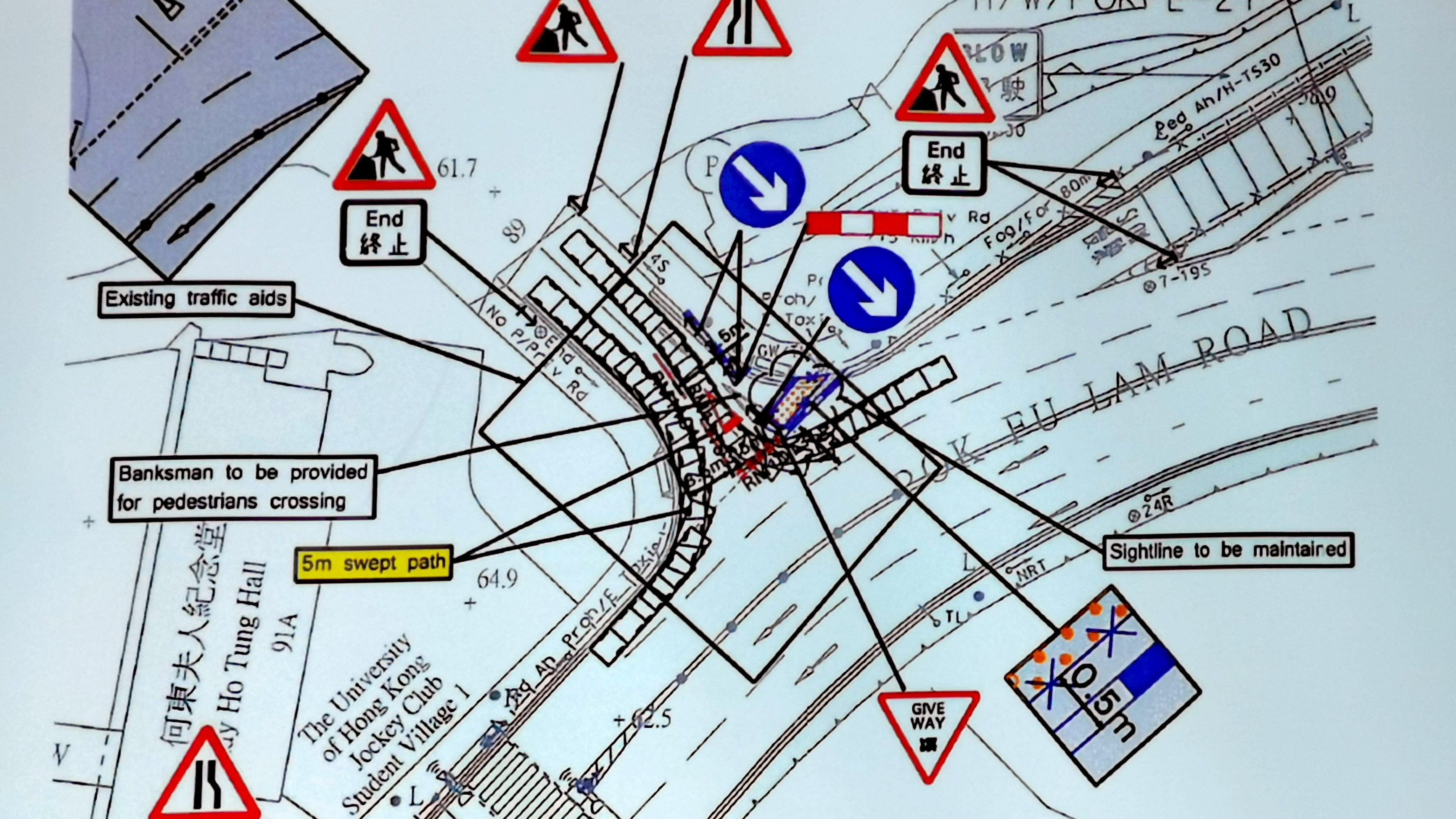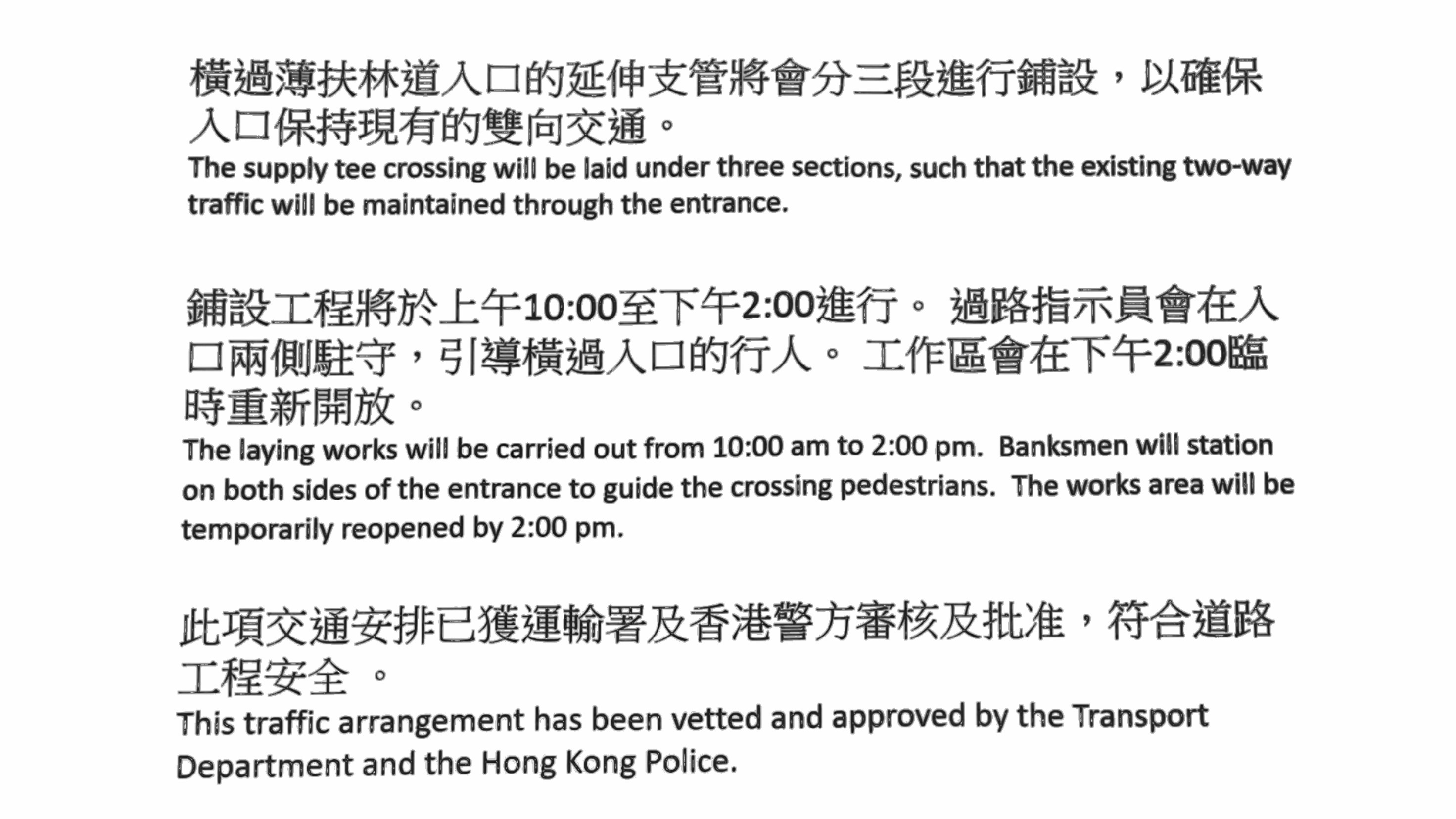 答:工程施工方案已獲運輸處及香港警務處審批,完全符合道路安全及消防通道要求。 另外處方已排期在暑假期間施工,工程只於每日上午十時至下午二時進行,以減低工程對學童使用校巴的影響。
