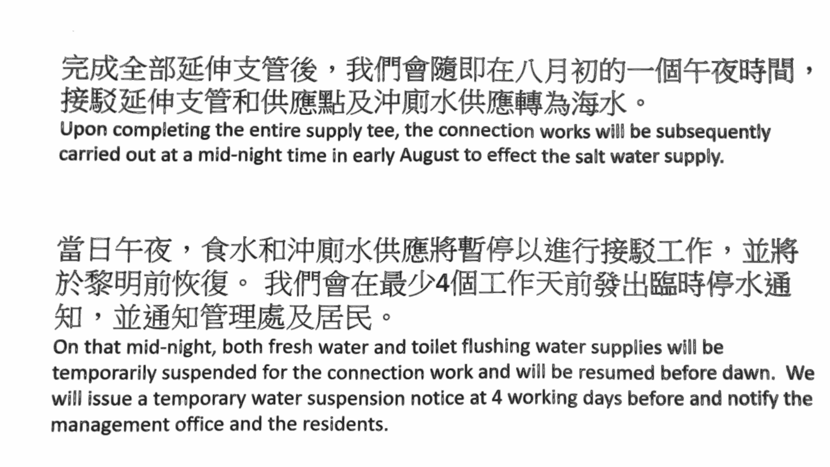 由於現時沖廁水是由食水供應,因此在接駁位置需要將淡水分流部份重新接駁,因此工程進行期間必須同時暫停食水及沖廁水供應。 而為了避開住戶用水高峰期,水務處會在路面工程完成後選擇一個夜深晚上(通常由午夜至黎明)進行轉換咸水供應最後接駁工程, 期間會與管理處協調提早加滿水箱,儘量減低對住戶帶來不便的影響。