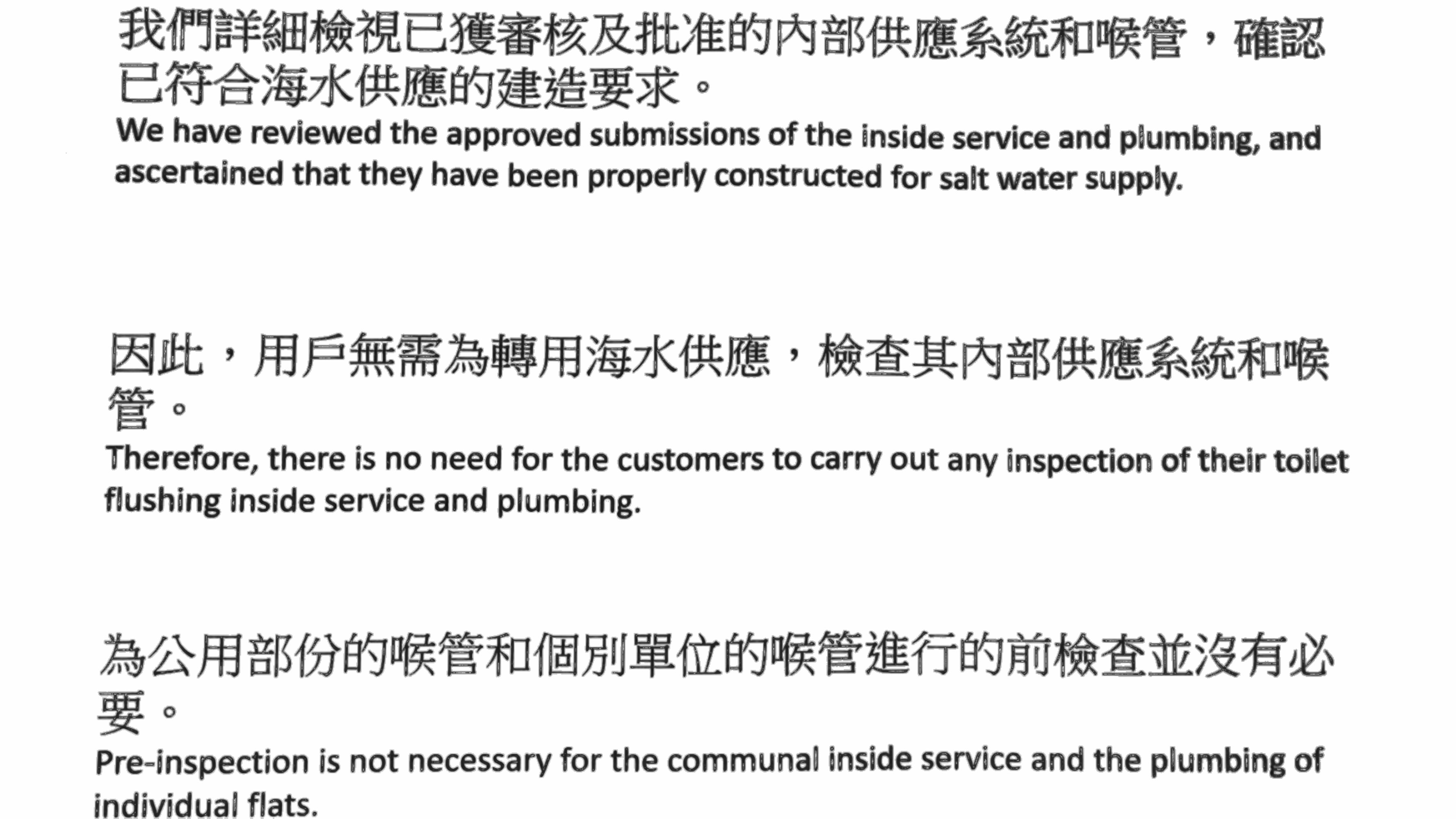 答:水務處一再強調公用部份及個別單位喉管符合海水供應標準,因此用戶無需為轉用海水供應而檢查內部供應系統和喉管。但考慮到業主對於曾經改動單位座厠的憂慮,會與管理處於稍後制作及提供相關資訊給所有業戶參考。業戶如有疑問亦可隨時聯絡水務處客服熱線 2824 5000 查詢。