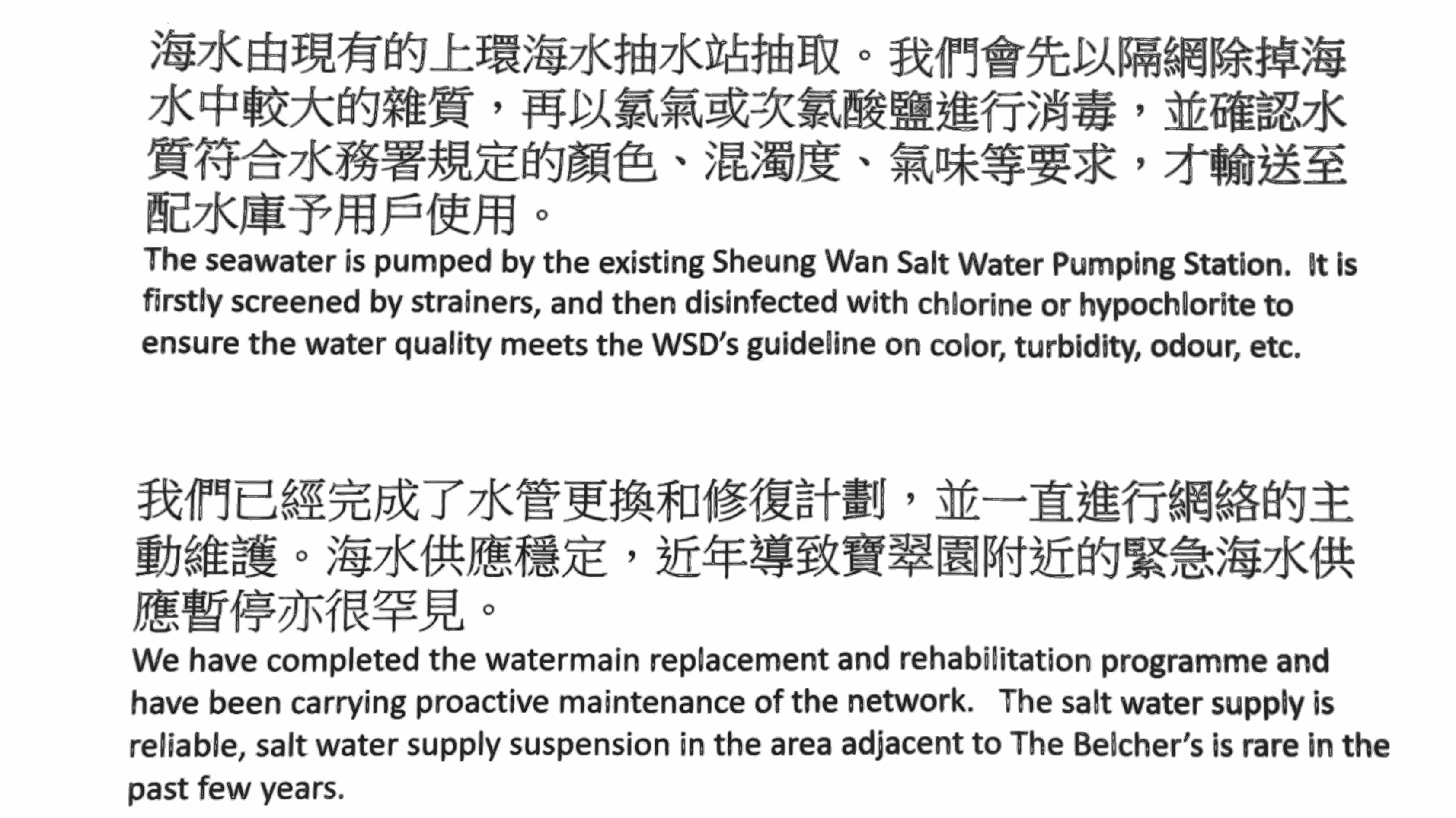 答:沖廁用的海水在輸送到屋苑前已經過消毒處理,須符合水務處規定的顏色、混濁度及氣味等要求,至於較大的雜質如泥沙會先由隔網除掉,然後再加氯或次氯酸鹽進行消毒(世衛組織證實有效消滅新冠肺炎病毒),才供應給用戶。處方亦會實時監測並採取適當措施控制沖廁水質,必要時如水質變差處方會啟動應變措施,即時調節咸水供應。
