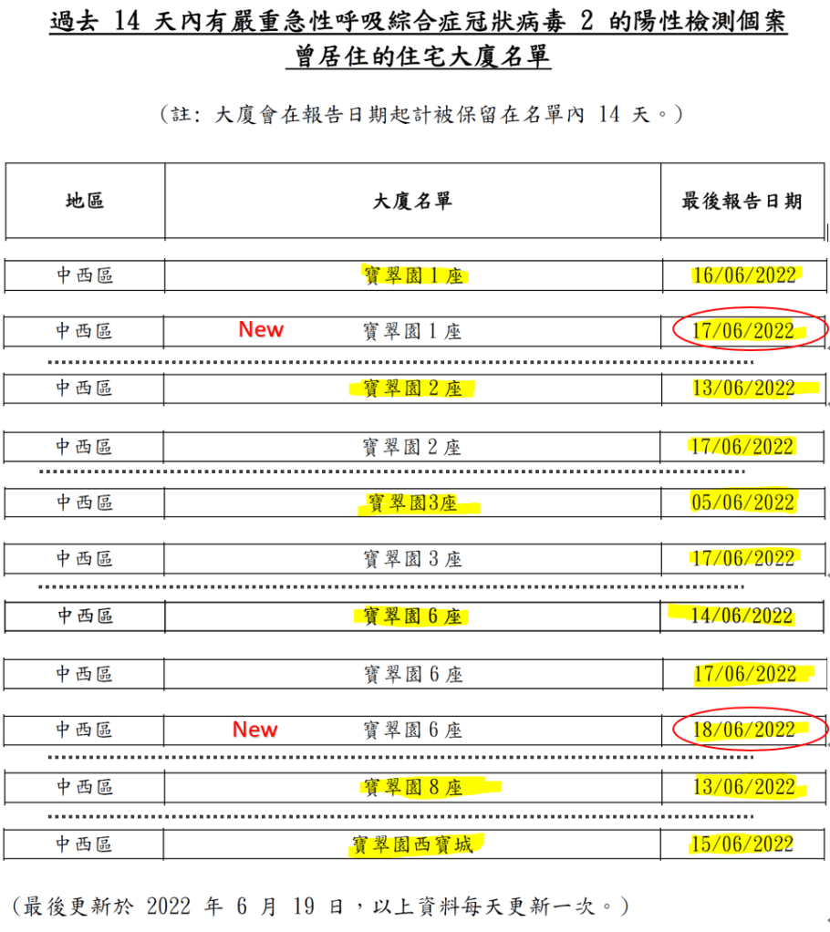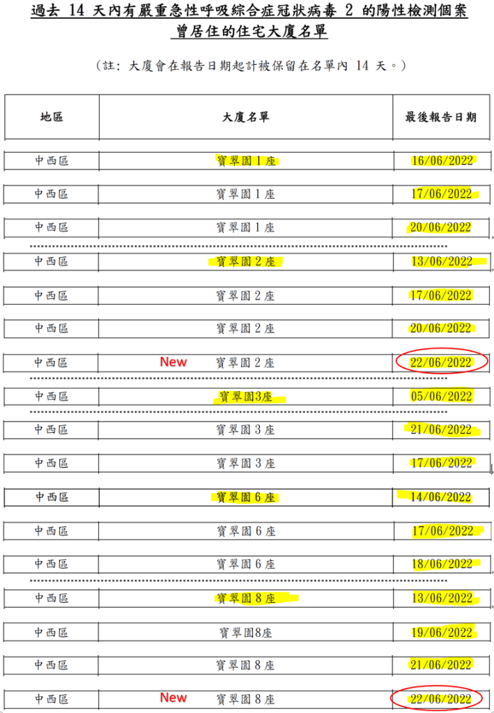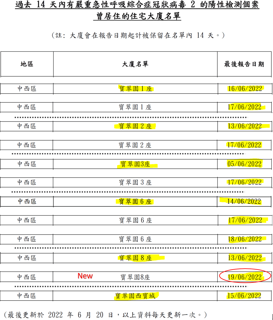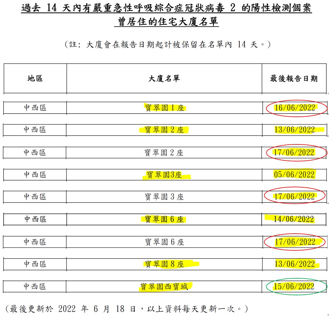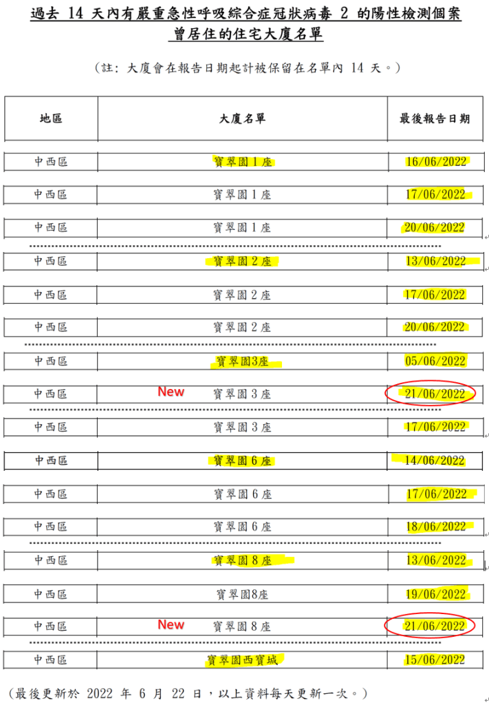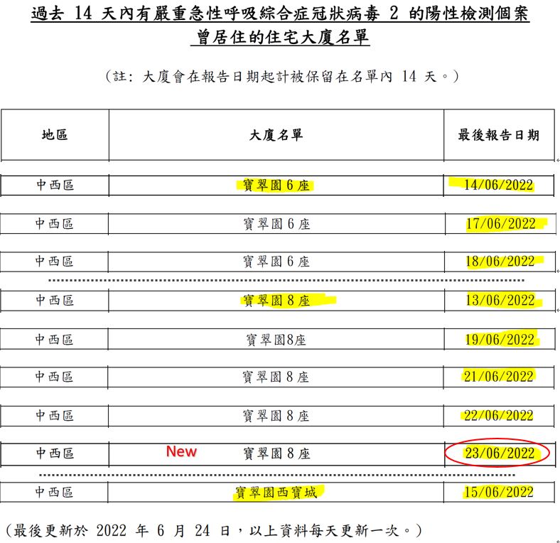 6月22日 2330hrs – 衛生署今天發出有關冠狀病毒陽性檢測個案確診大廈名單 (第三及八座再有新確診個案)