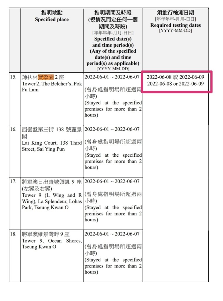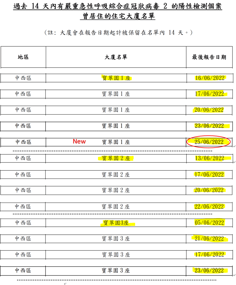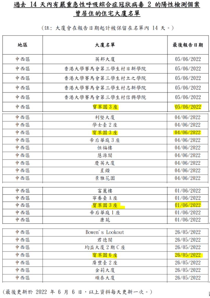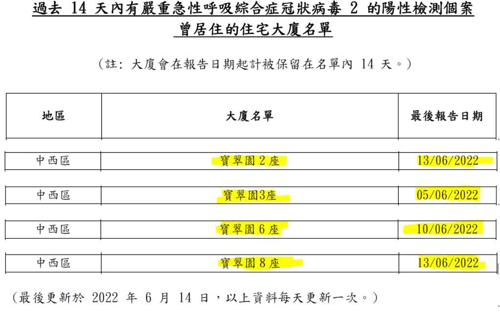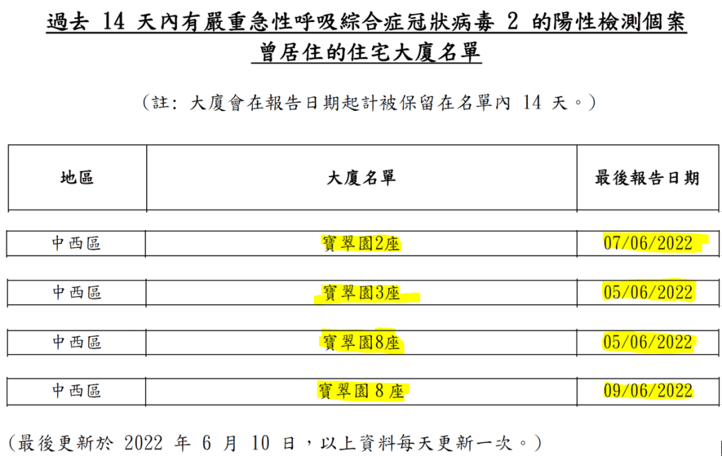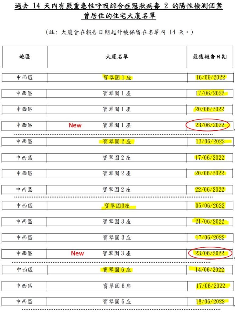 6月22日 2330hrs – 衛生署今天發出有關冠狀病毒陽性檢測個案確診大廈名單 (第三及八座再有新確診個案)
