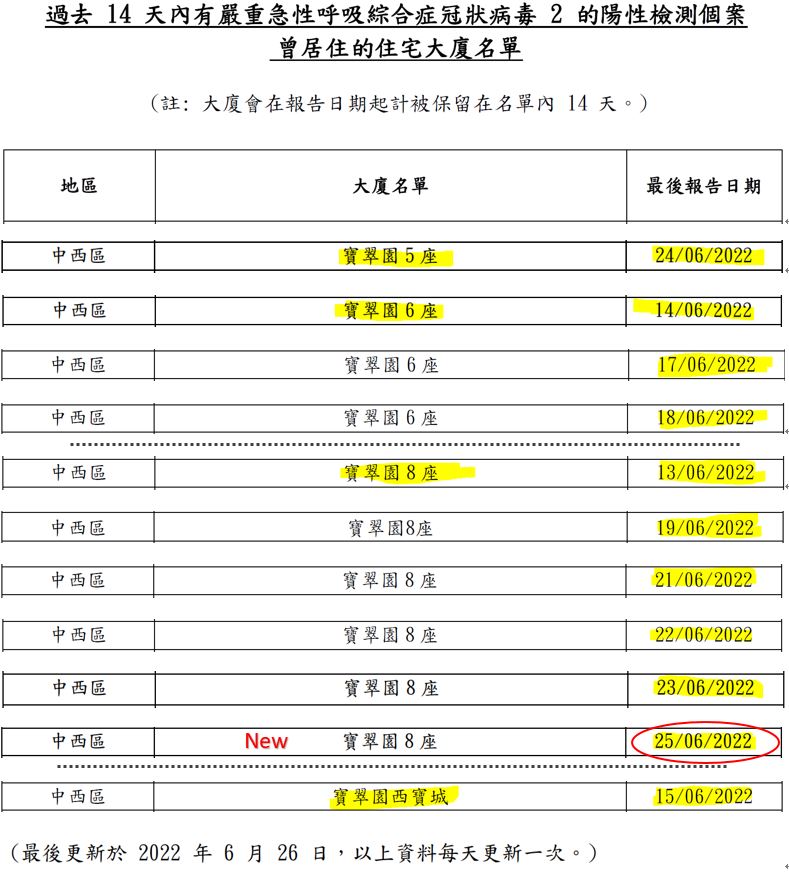 6月26日 2200hrs – 衛生署今天發出有關冠狀病毒陽性檢測個案確診大廈名單 (第座有新確診個案)