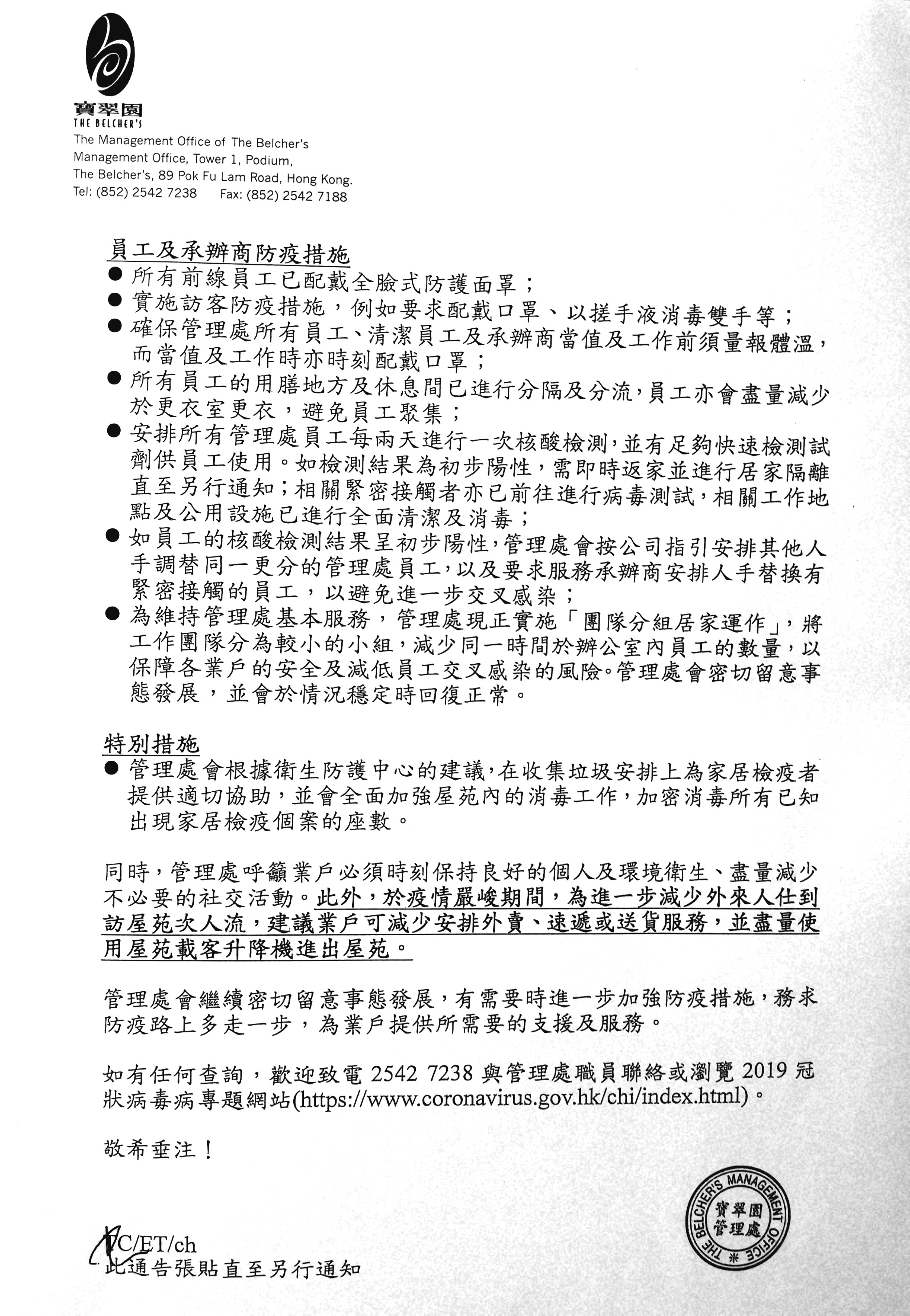 隨著政府提高強制檢測門檻及火眼實驗室將於明天(2月15日)加入運作,預計每日檢測量將會在短時間內大為提昇。管理處會繼續安排員工分批有序定期檢測,將居住在有強檢令處所的員工有效分隔,在平衡維持屋苑服務以外,盡力將病毒擴散的風險減至最低,保障各住戶的安全。