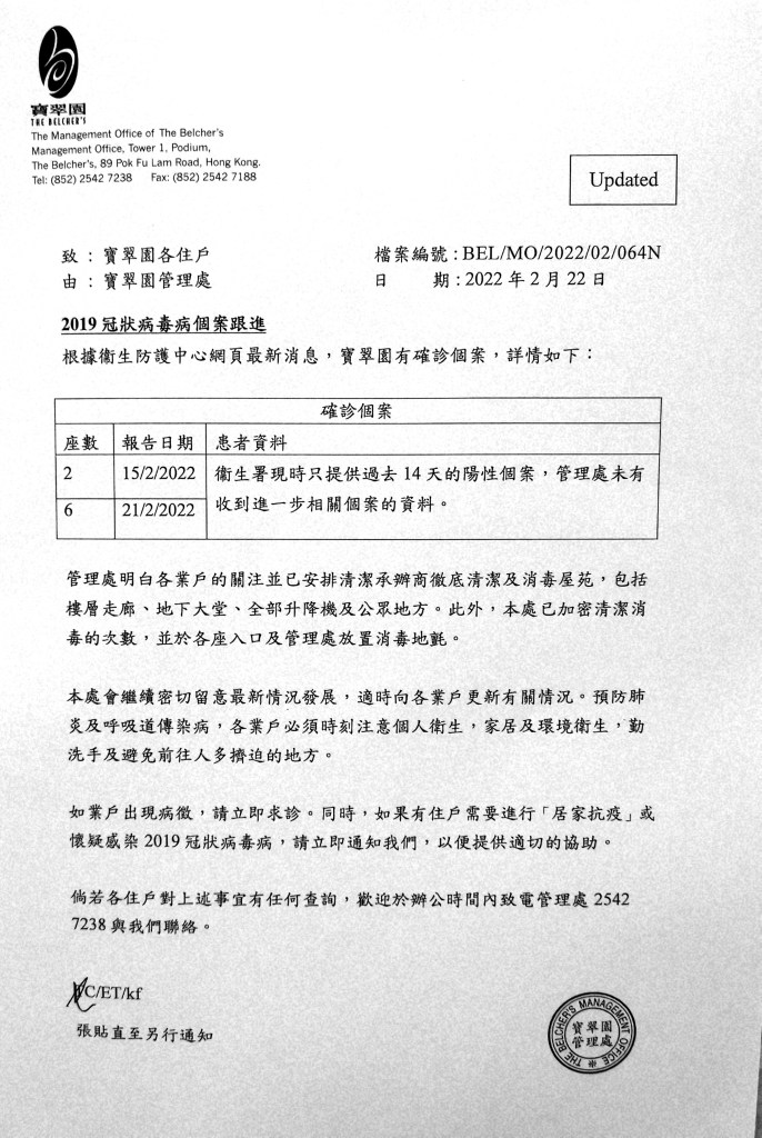 2月21日 2350hrs – 根據政府今天最新公告, 寶翠園第六座在過去14天內有確診個案