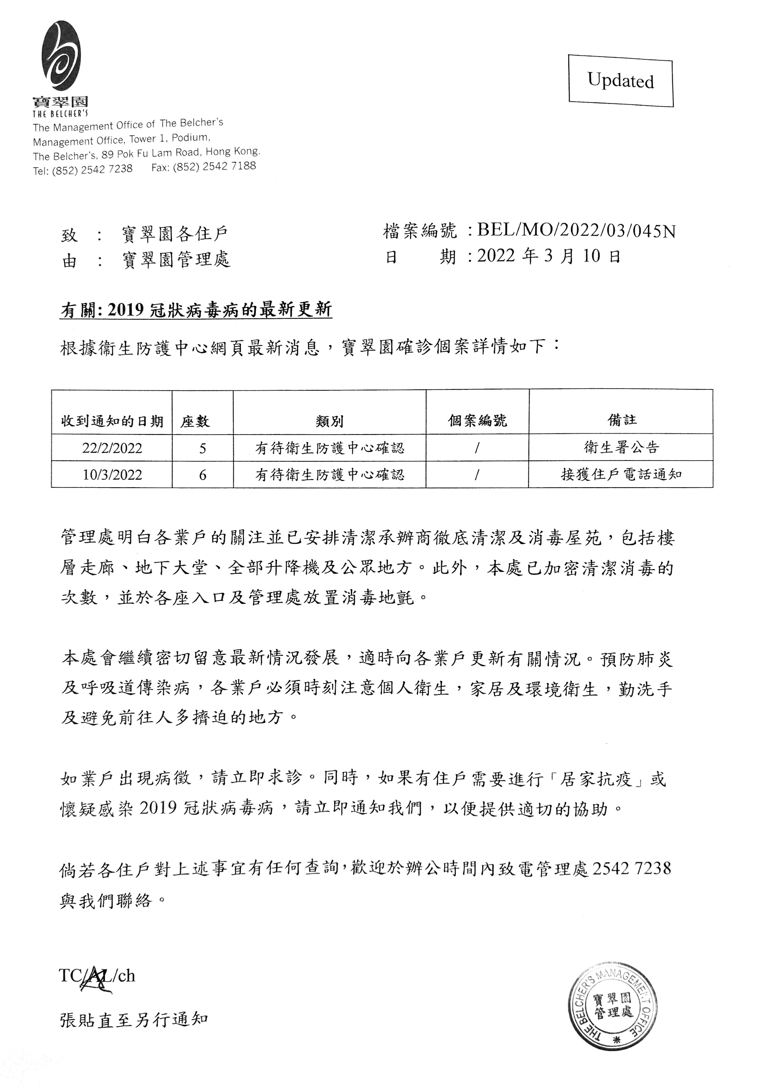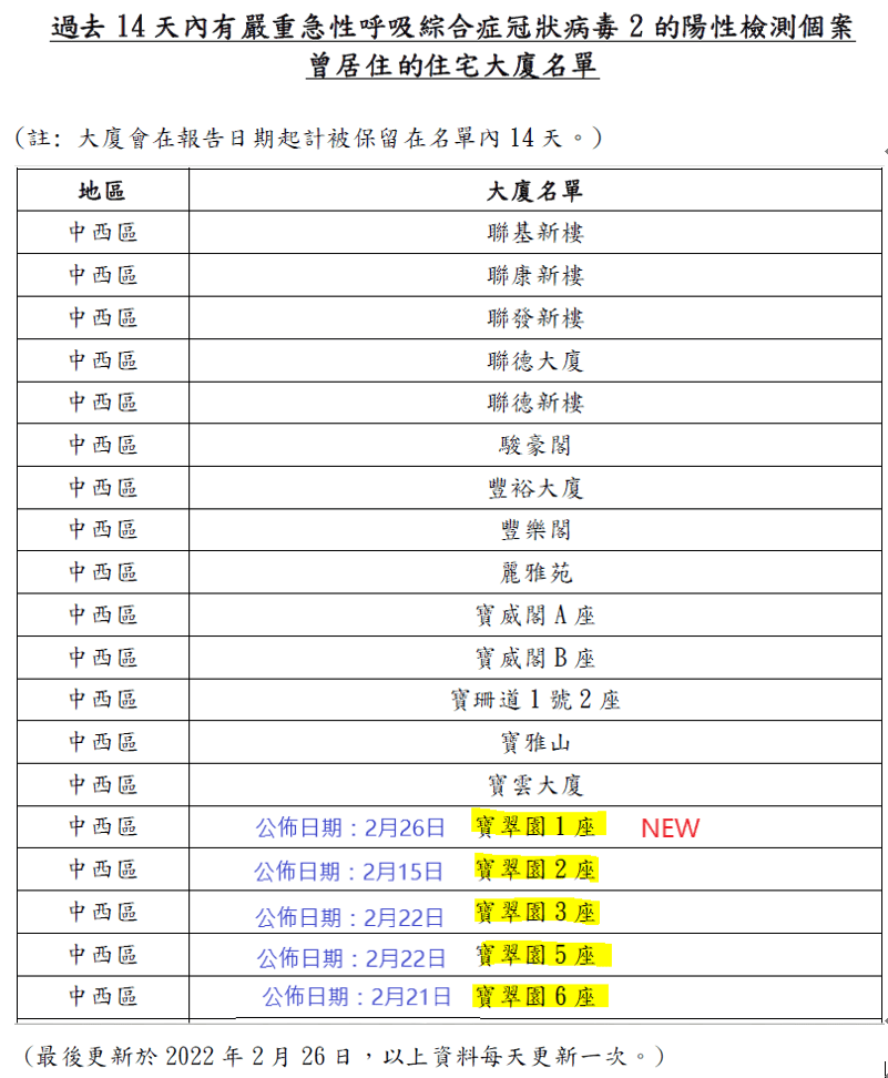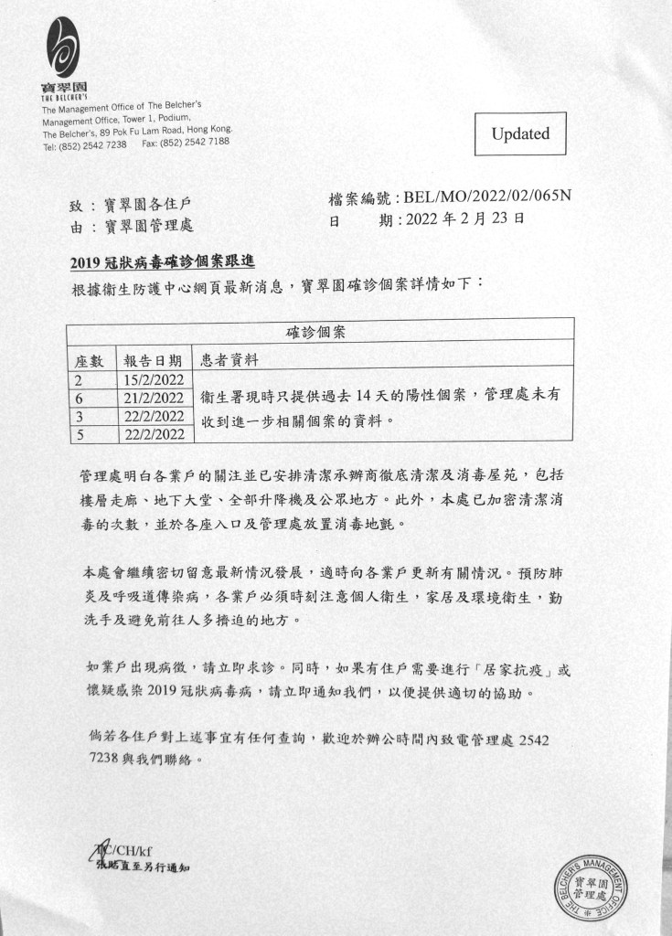 2月26日 2230hrs – 根據政府今天公告, 寶翠園第一座在過去14天內有確診個案出現