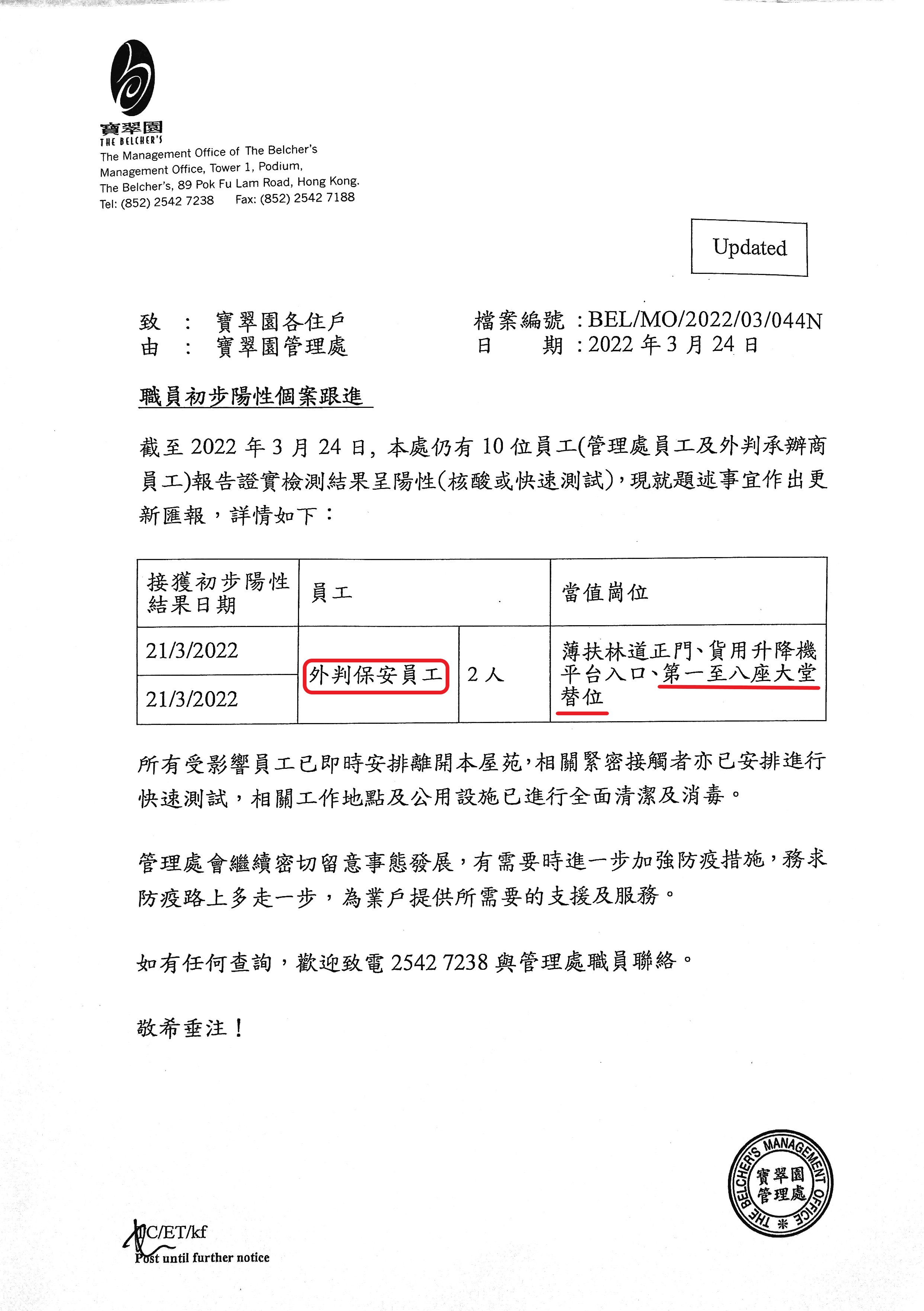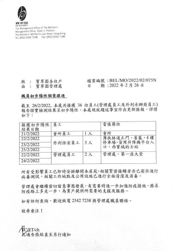 2月24日 2100hrs 外判及管理處職工確診 (2月26日更新通告)