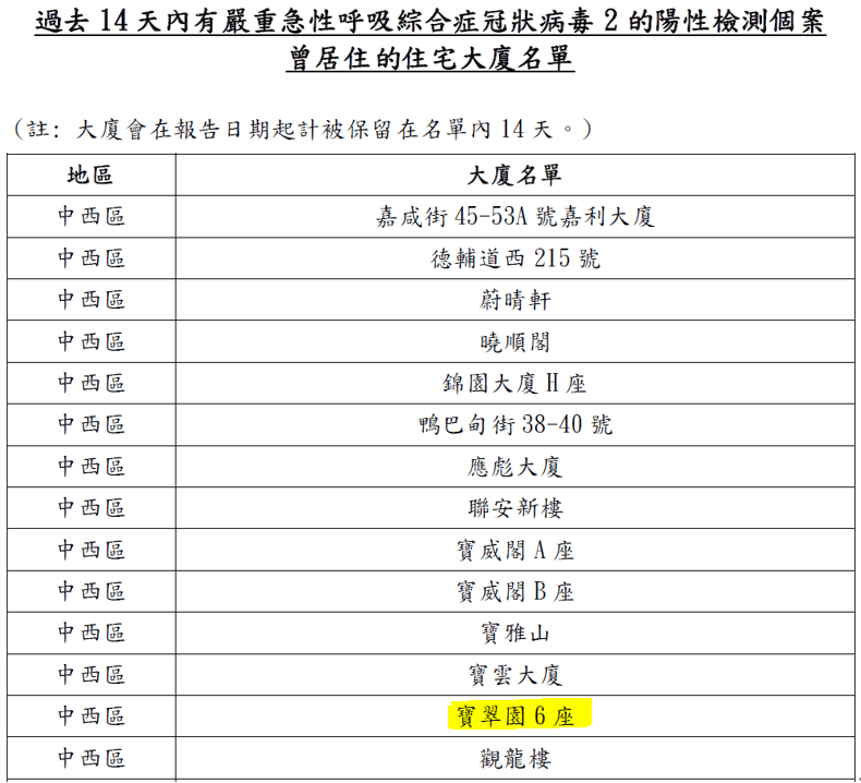 曾居住的住宅大廈名單 (註: 大廈會在報告日期起計被保留在名單內 14 天。)