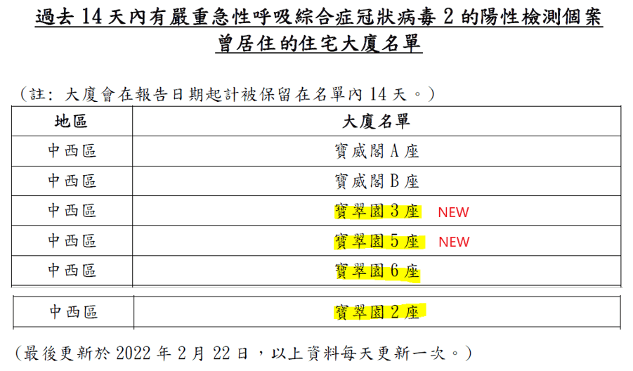 2 月 15 日曾有確診或疑似2019冠狀病毒病個案的大廈名單