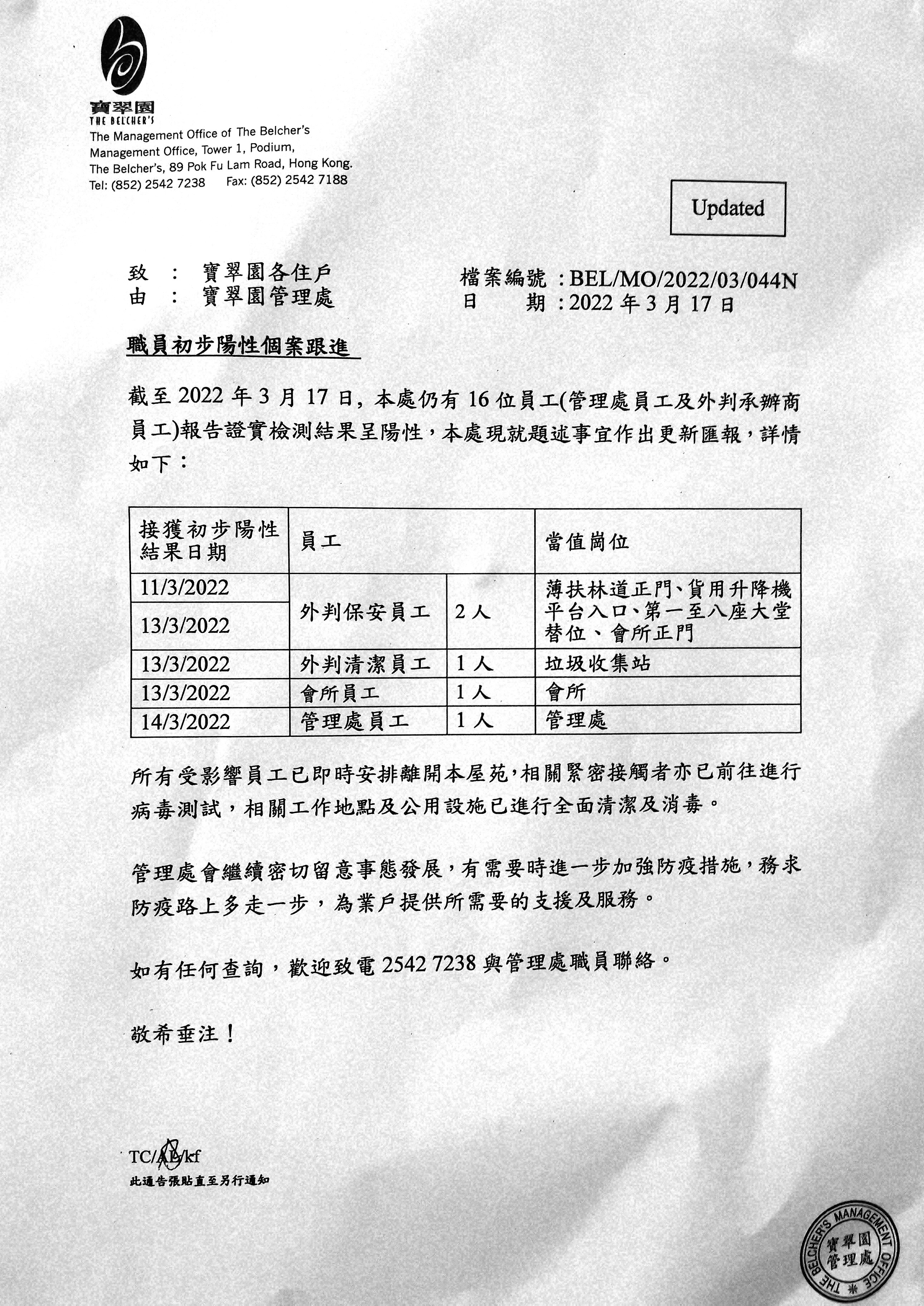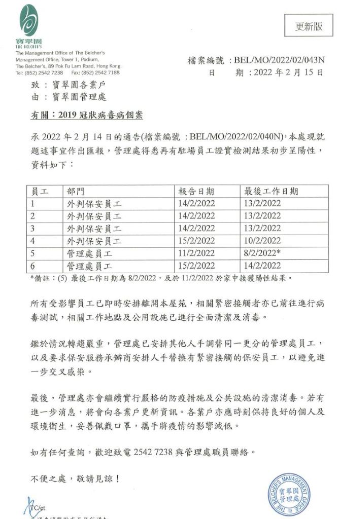 2月17日 1900hrs 外判及管理處職工確診更新通告