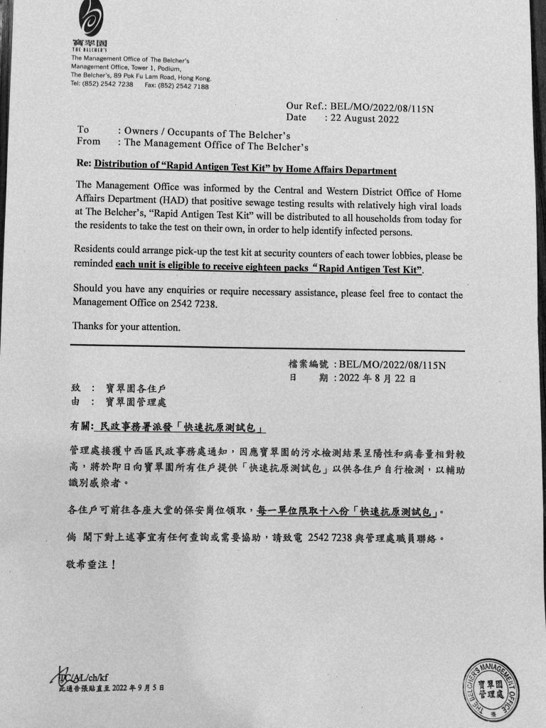 9月22日 2230hrs – 根據衛生防護中心今晚發出的最新強制檢測公告, 本苑第一座居民及曾於 9月16日至9月22日期間在上述地址逗留超過兩小時人仕,必須於9月24日前到附近社區檢測中心完成強制檢測。 違例又未有遵守檢測令者會被檢控及罰款一萬!詳情可留意民政事務處及管理處稍後通告。