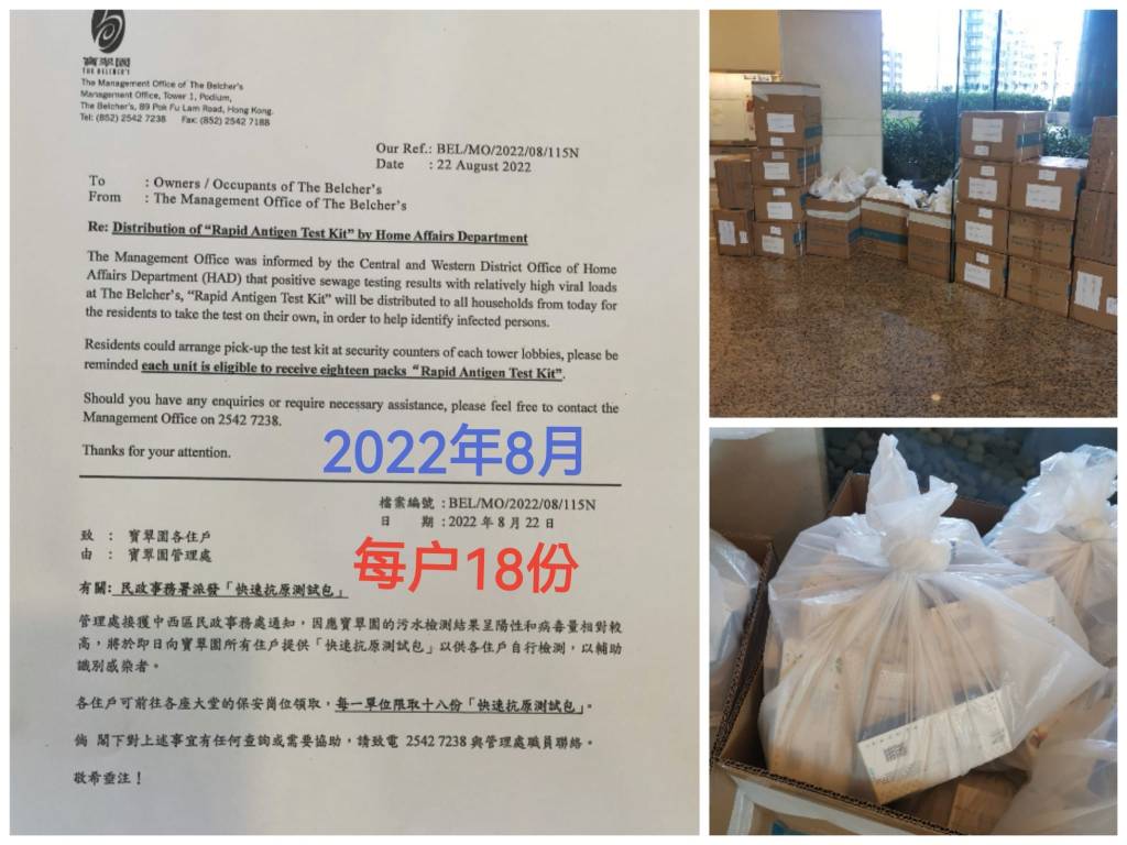 管理處已完成派發快速檢測套裝到各座住戶信箱, 民政署現只免費發送每戶4個測試包,需要額外數量的住戶需自行購買或致電民政署熱線求助。