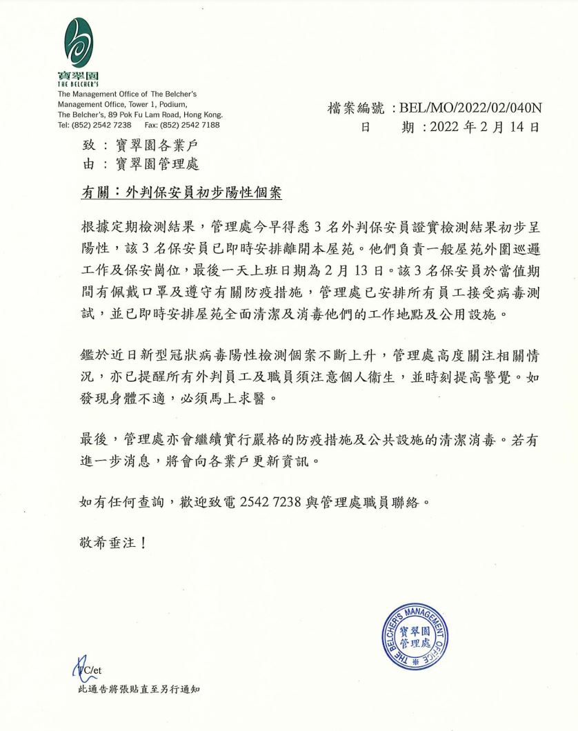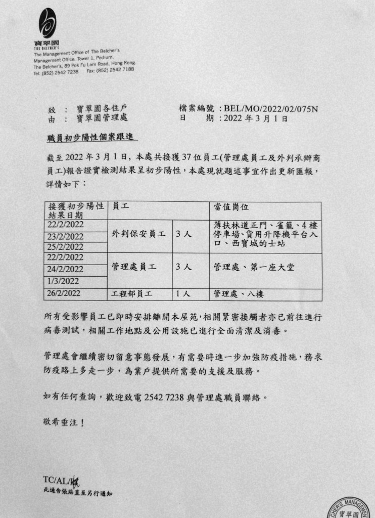 「截至現時還未收到消息,一切以衛生署消息為準。如有確診,管理處必定盡快通知住户。」