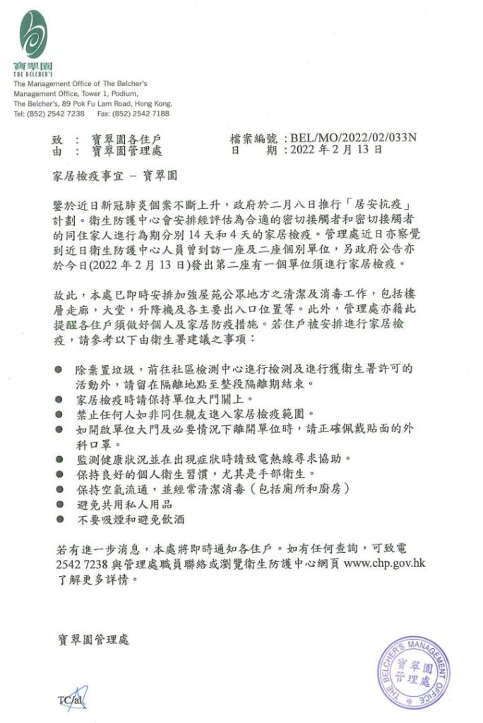 2月13日 0130hrs – 第二座有個別住戶經衛生署甄别 正接受家居檢疫安排。