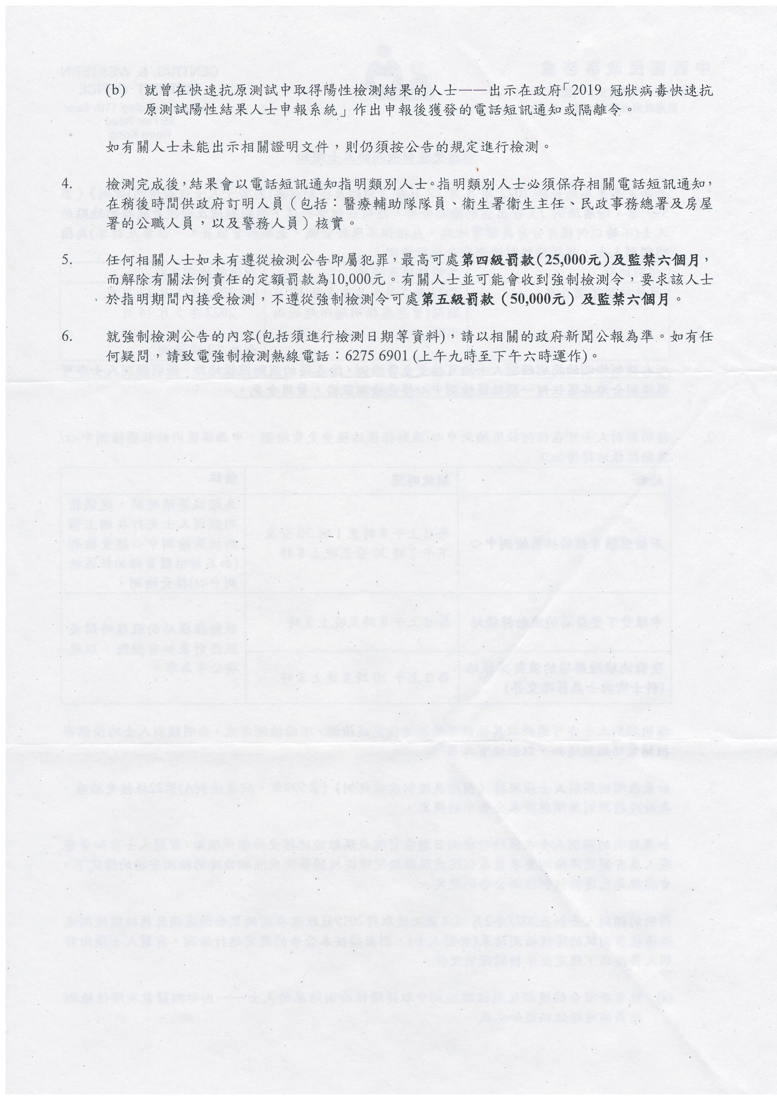 根據衛生防護中心今晚發出的最新強制檢測公告, 本苑第2座居民及曾於 11月19日至11月25日期間在上述地址逗留超過兩小時人仕,必須於11月27日前到附近社區檢測中心完成免費強制檢測。 違例又未有遵守檢測令者會被檢控及罰款一萬!詳情可留意民政事務處及管理處稍後通告。