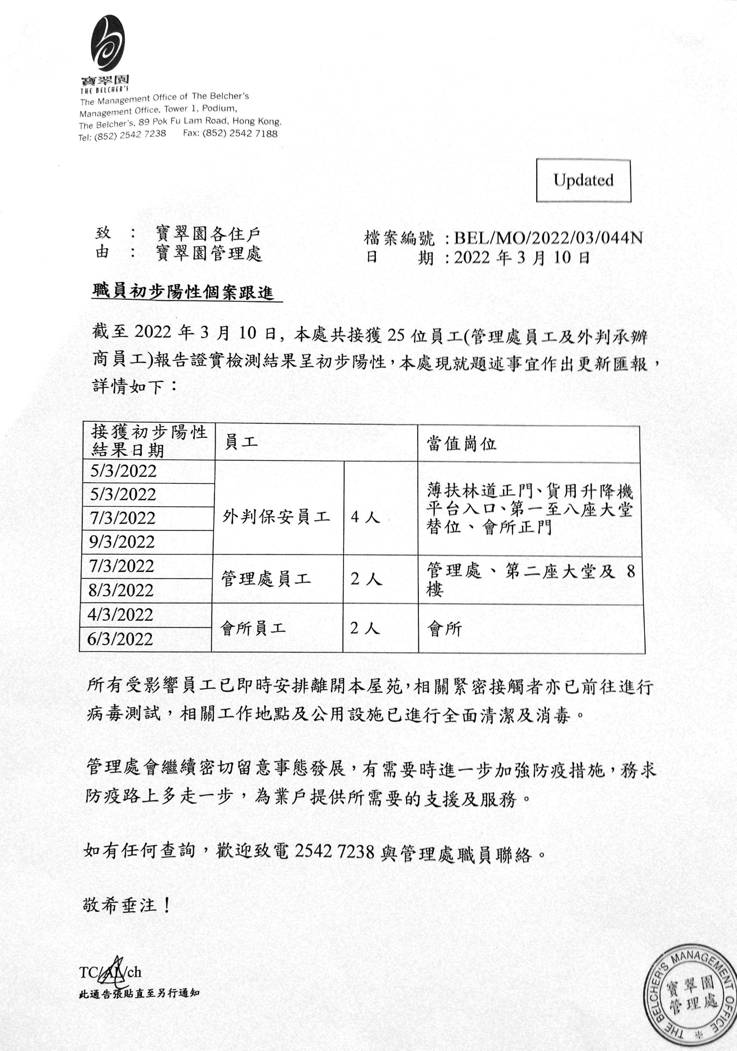 管理處已於三月下旬開始停止向居民發放駐場職工確診訊息,未有進一步解釋原因