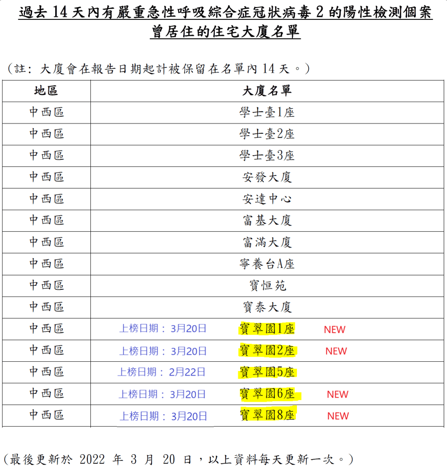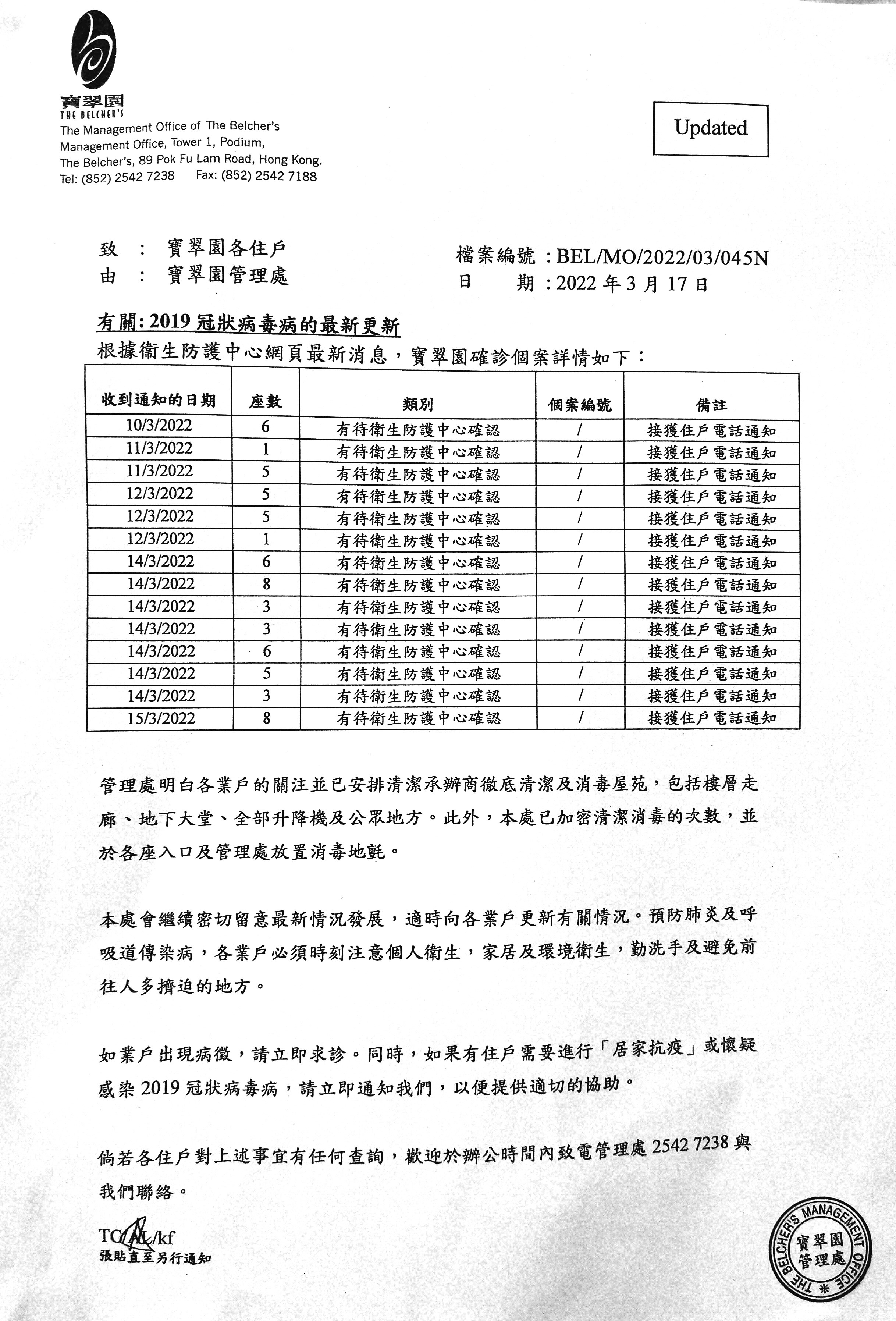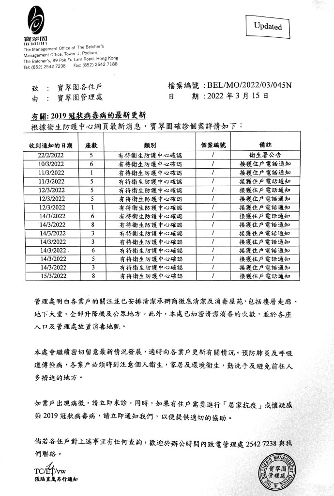 3月21日 1800hrs – 根據政府昨天(3月20日)最新公告, 寶翠園繼第五座在過去14天內有確診個案出現外,第一、二、六及第八座都被納入在公告名單上。據知衛生處暫時未有向上述處所居民發出强制檢測令