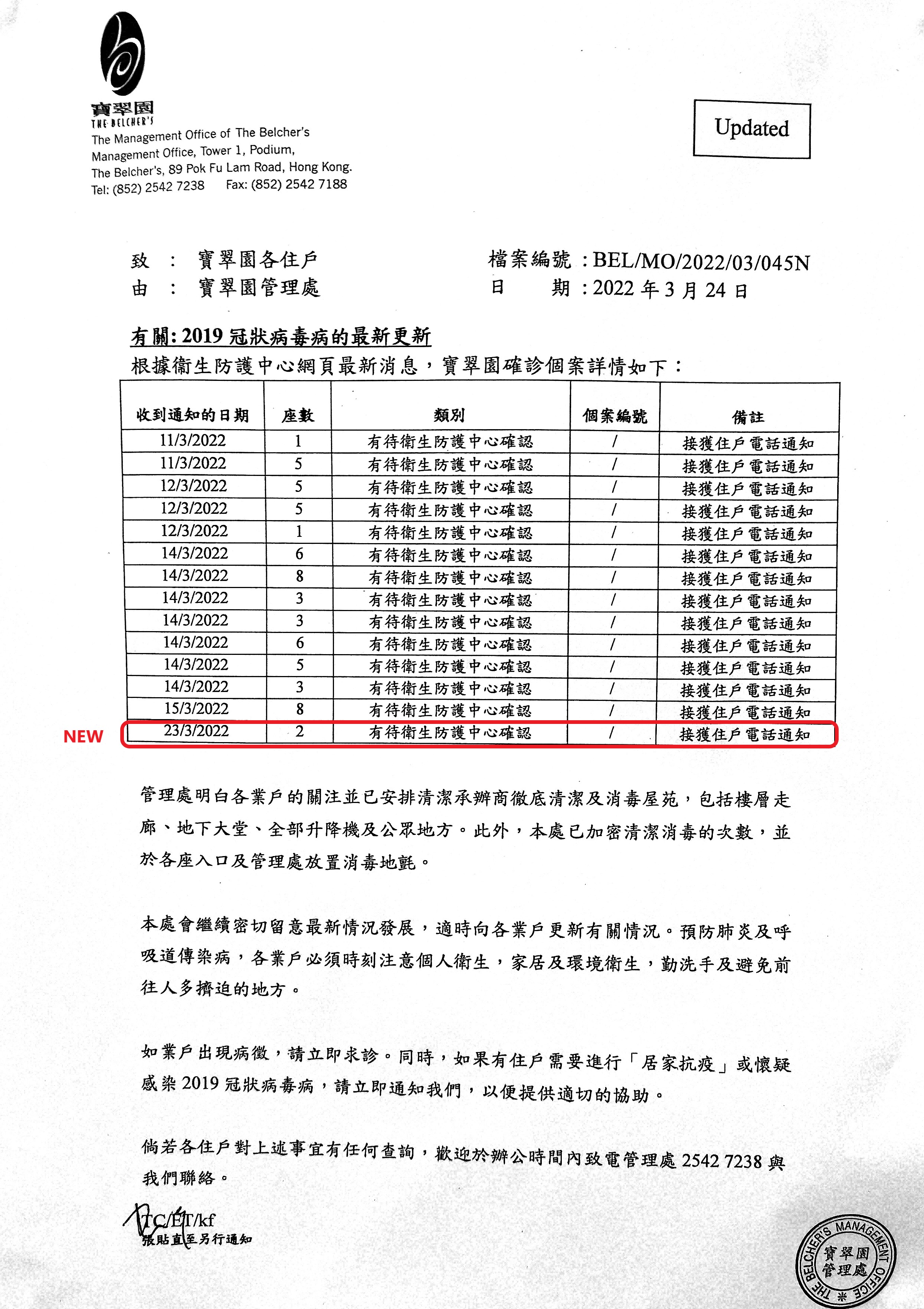 3月23日第2座居民 / 最少1人確診管理處接獲住戶通知