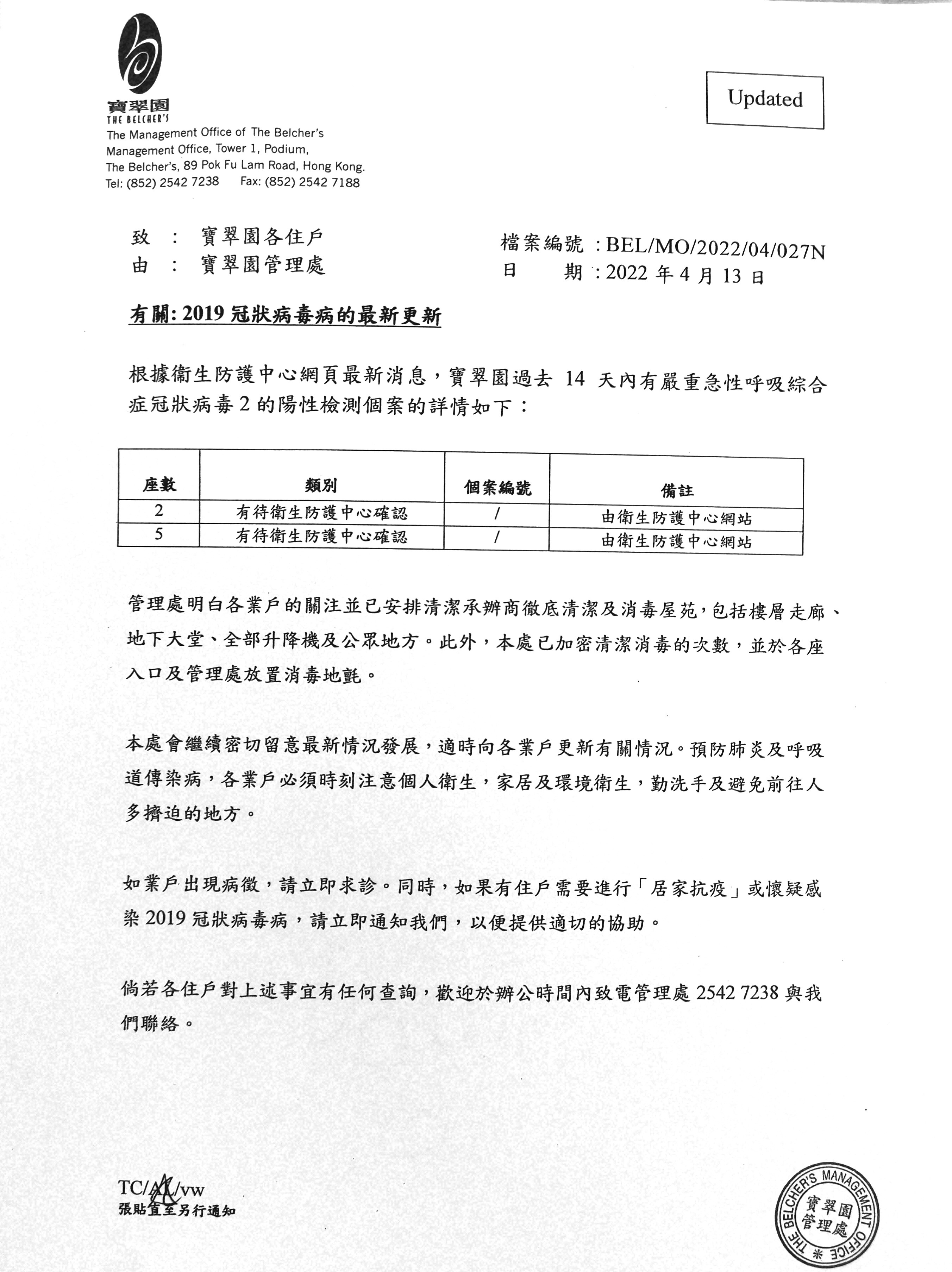 4月17日 1200hrs – 根據政府發出的最新公告, 寶翠園第2及第1分別4月5及16日起重新上榜並會按慣例被保留在名單內14天。據知衛生處暫時未有向上述處所居民發出强制檢測令