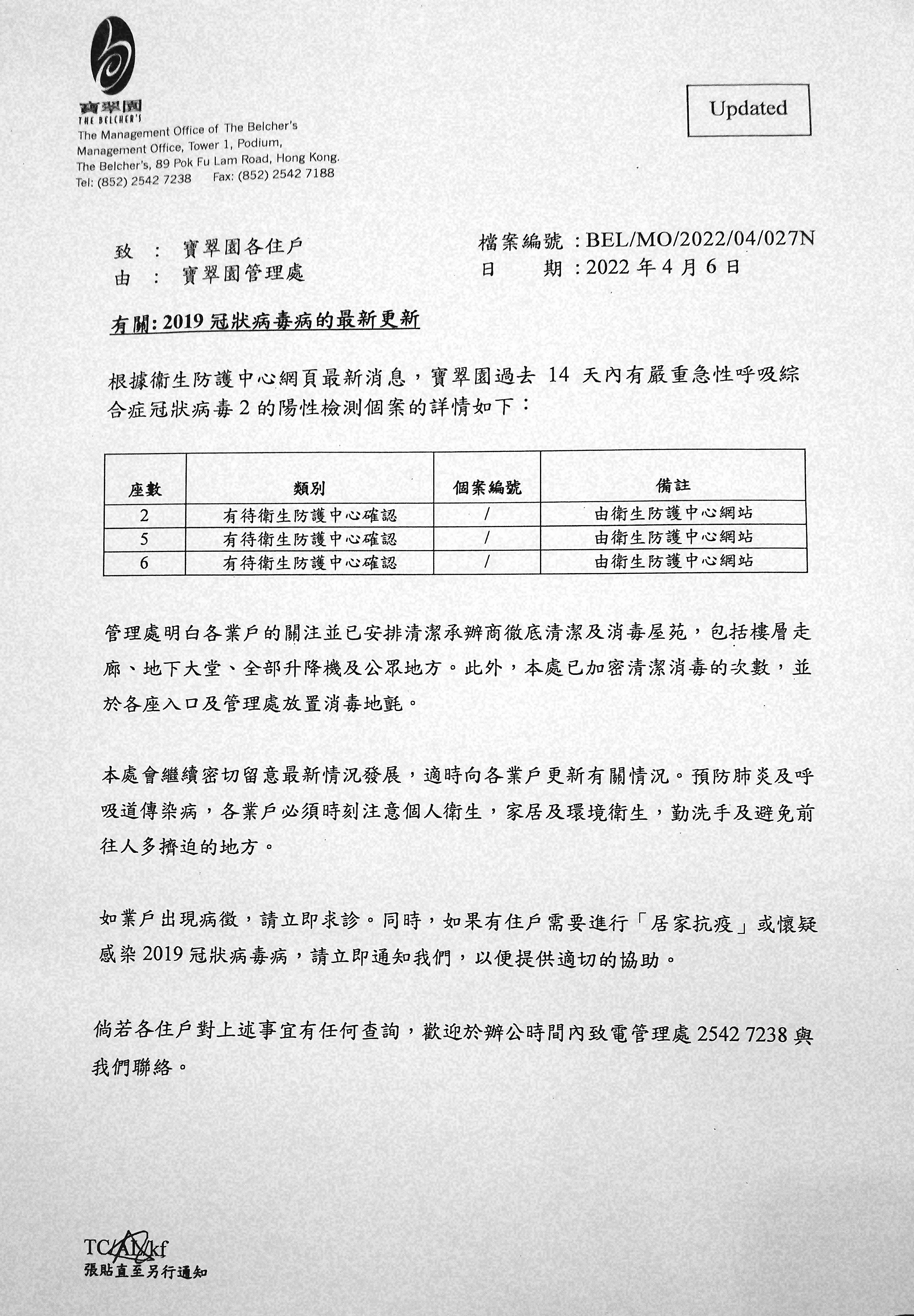 4月14日 1800hrs – 根據政府發出的最新公告, 寶翠園第6及第5座已分別4月11及13日起被除名現時全屋苑只有第二座仍然被納入在公告名單上。據知衛生處暫時未有向上述處所居民發出强制檢測令