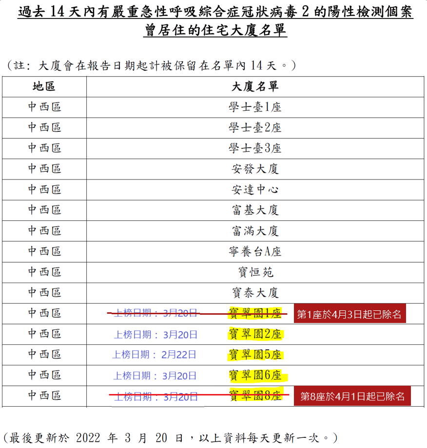 4月1日 1000hrs – 根據政府昨天(3月31日)最新公告, 寶翠園第8座已於4月1日起被除名現時第一、二、及第座仍然被納入在公告名單上。據知衛生處暫時未有向上述處所居民發出强制檢測令