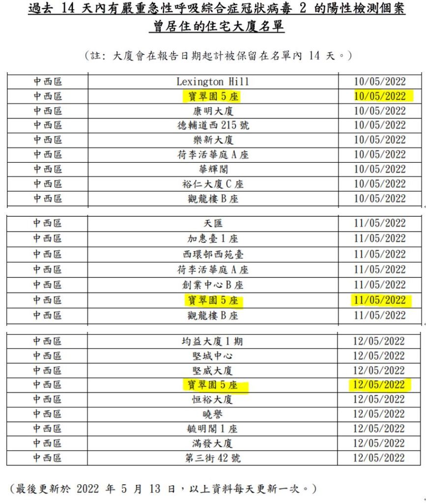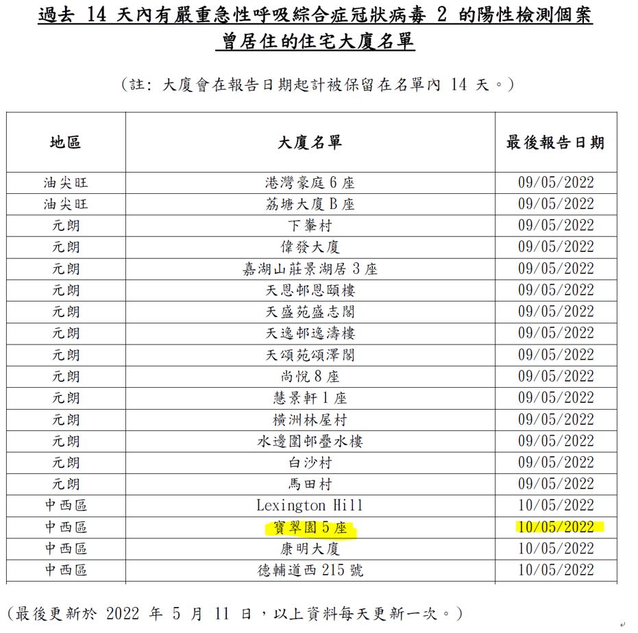 5月12日 1500hrs – 第五座於5月10日起重新上榜。據知衛生處暫時未有向上述處所居民發出强制檢測令