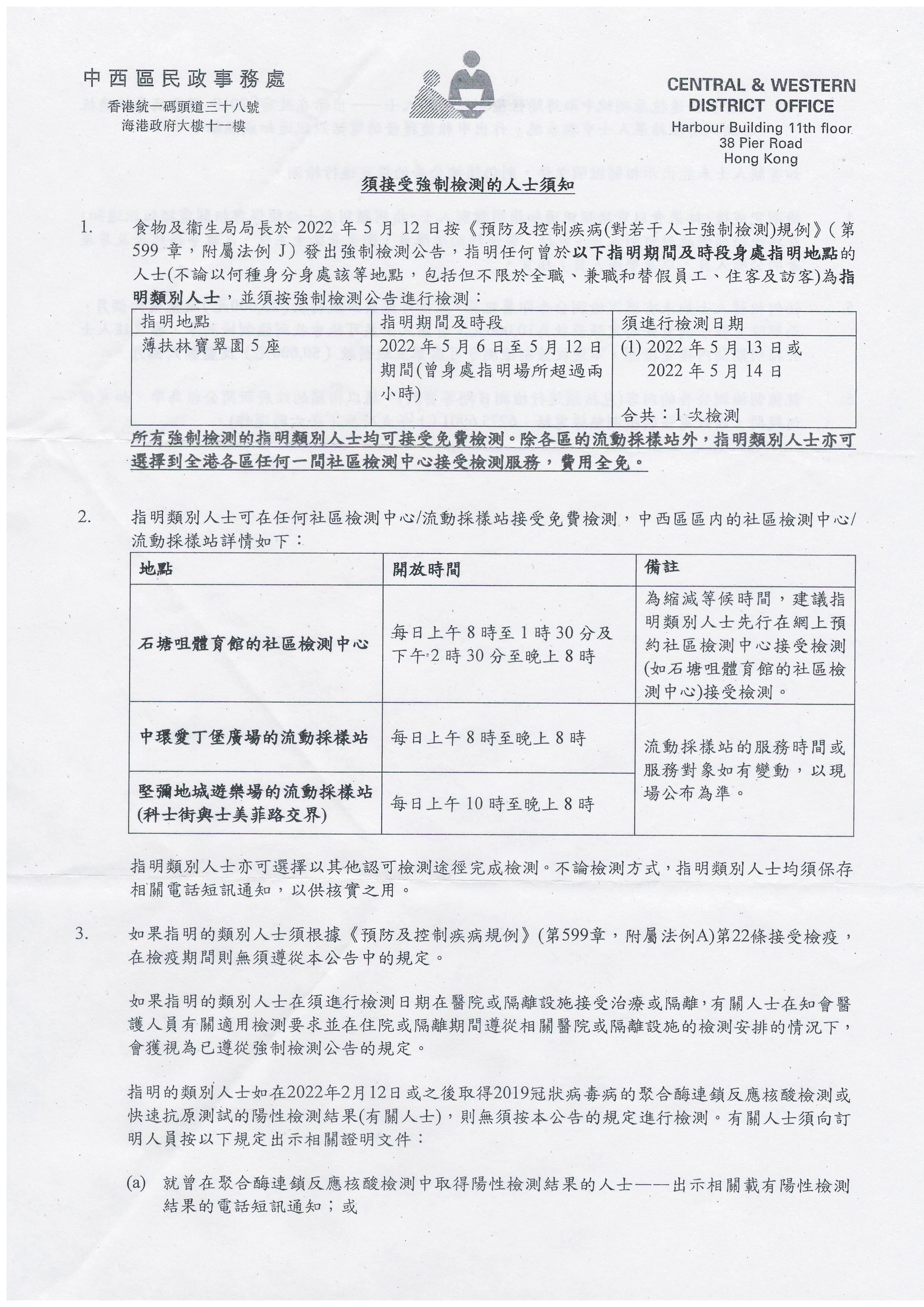 5月12日 1900hrs – 政府今日傍晚時分(12日)就第599J章《預防及控制疾病(對若干人士強制檢測)規例》下的強制檢測公告刊憲,要求於指定期間曾身處寶翠園第5座的人士,須於明日至後日(13日至14日)期間進行病毒檢測。