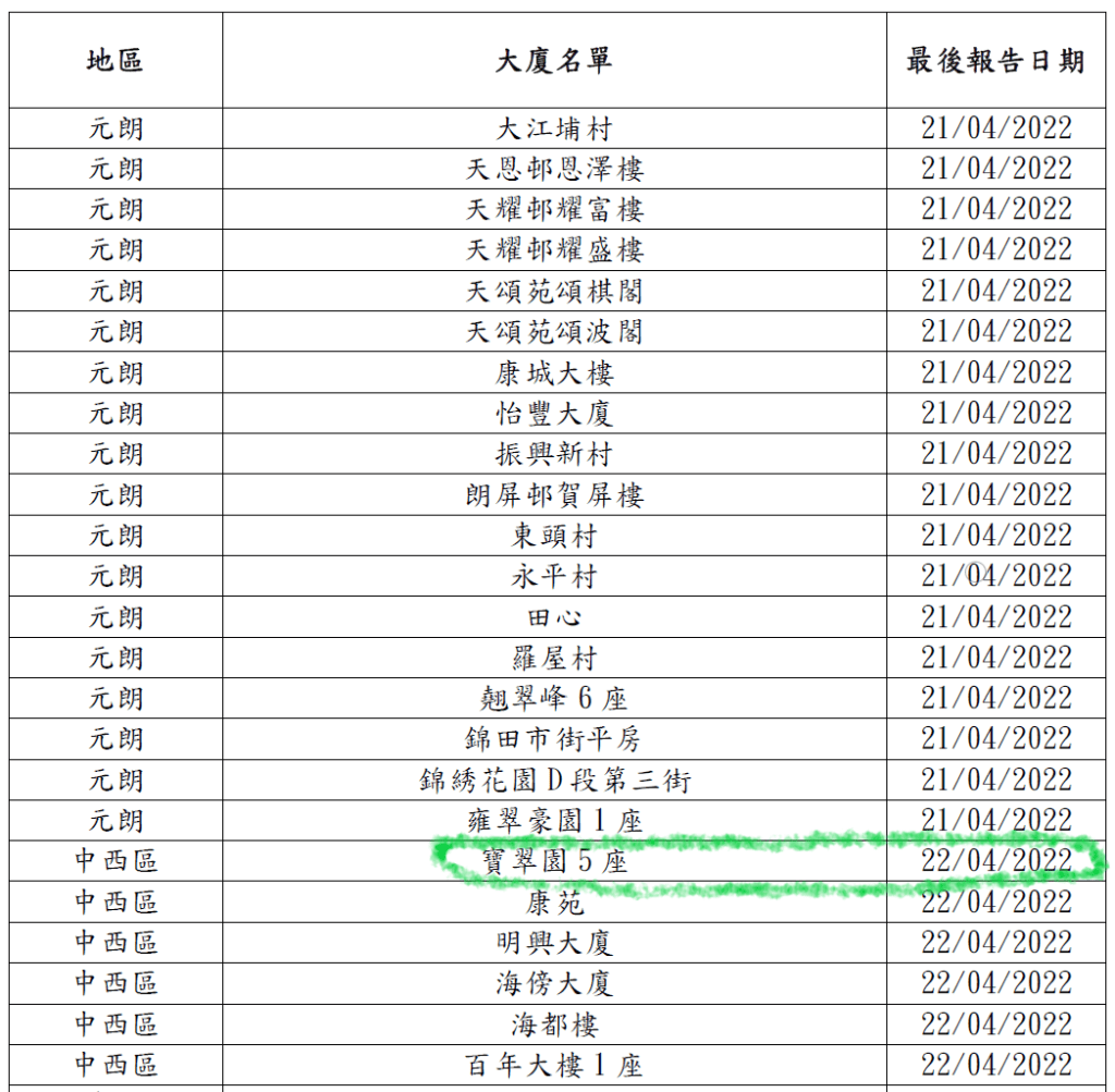 4月4日 1000hrs – 根據政府昨天(4月3日)最新公告, 寶翠園第1座已於4月3日起被除名現時第二、及第座仍然被納入在公告名單上。據知衛生處暫時未有向上述處所居民發出强制檢測令
