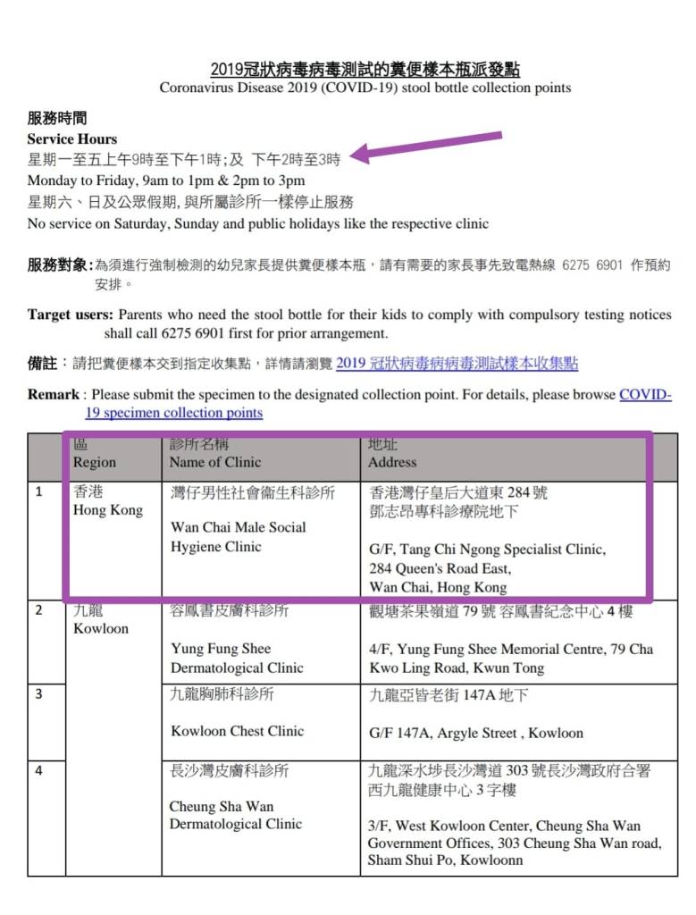 如家有三歲以下小孩或不適合於呼吸道採樣人士,可向位於灣仔的鄧志昂專科診療院索取「大便樣本收集包」為幼兒採樣(見下圖),代替鼻咽喉合併式子方法採樣。查詢:62756901