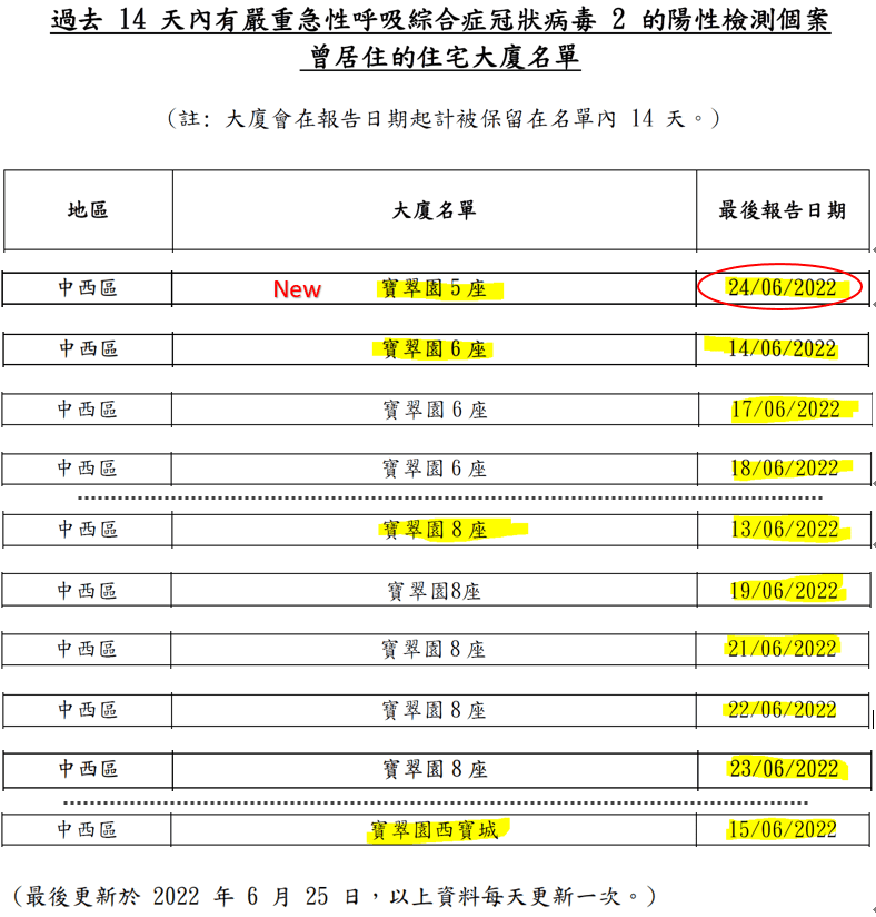 6月25日 1900hrs – 衛生署今天發出有關冠狀病毒陽性檢測個案確診大廈名單 (第五座有新確診個案)