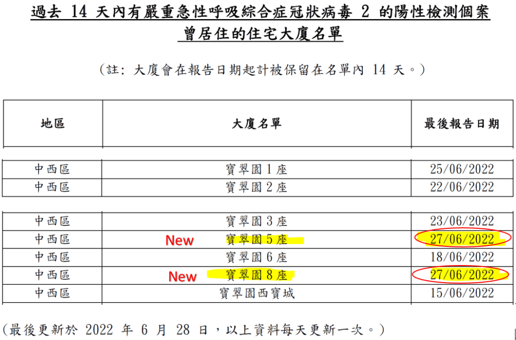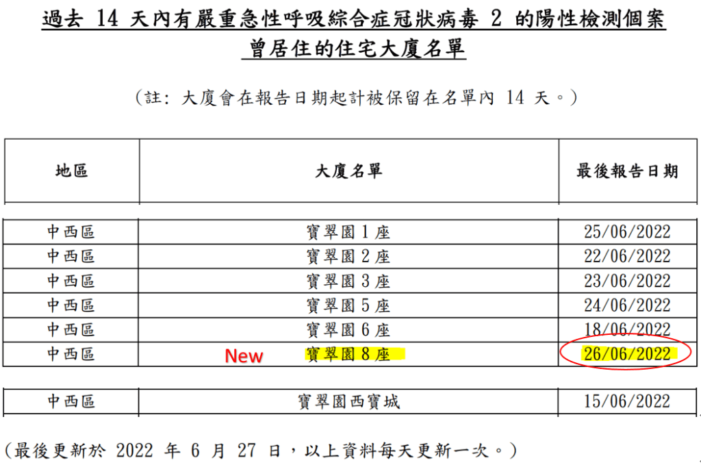 6月27日 2100hrs – 衛生署今天發出有關冠狀病毒陽性檢測個案確診大廈名單 (第八座有新確診個案)