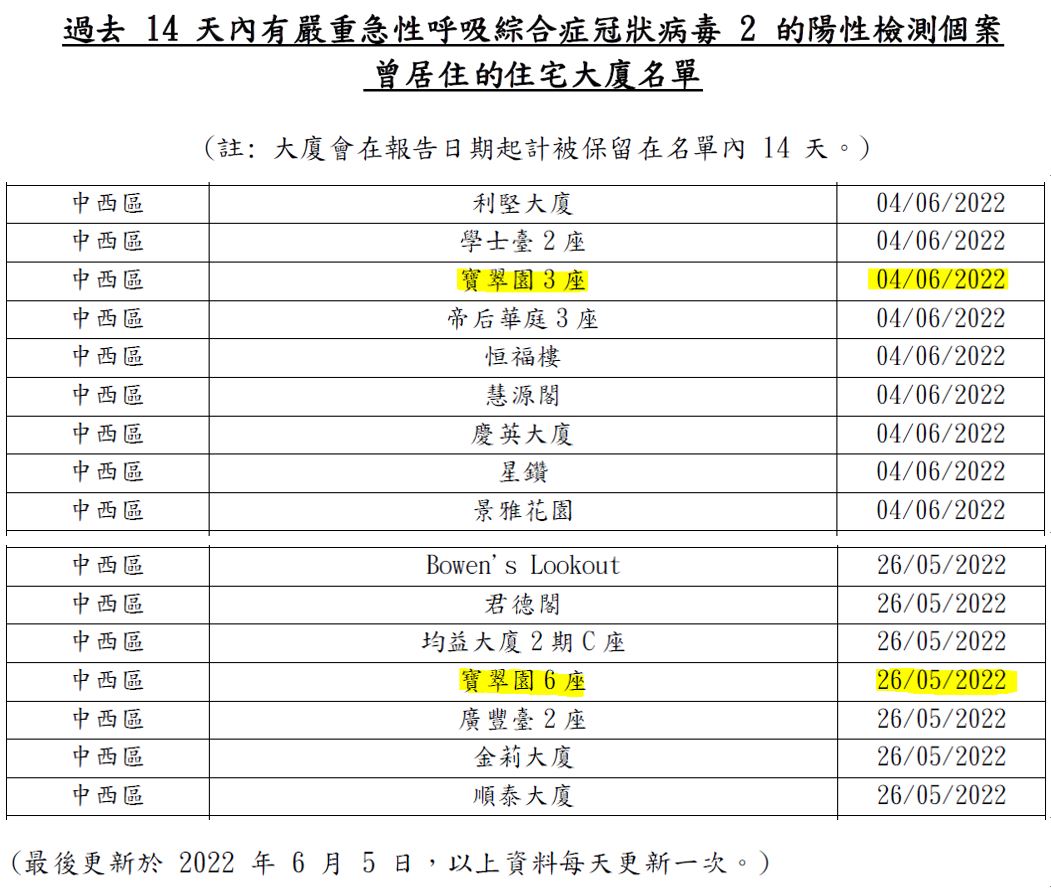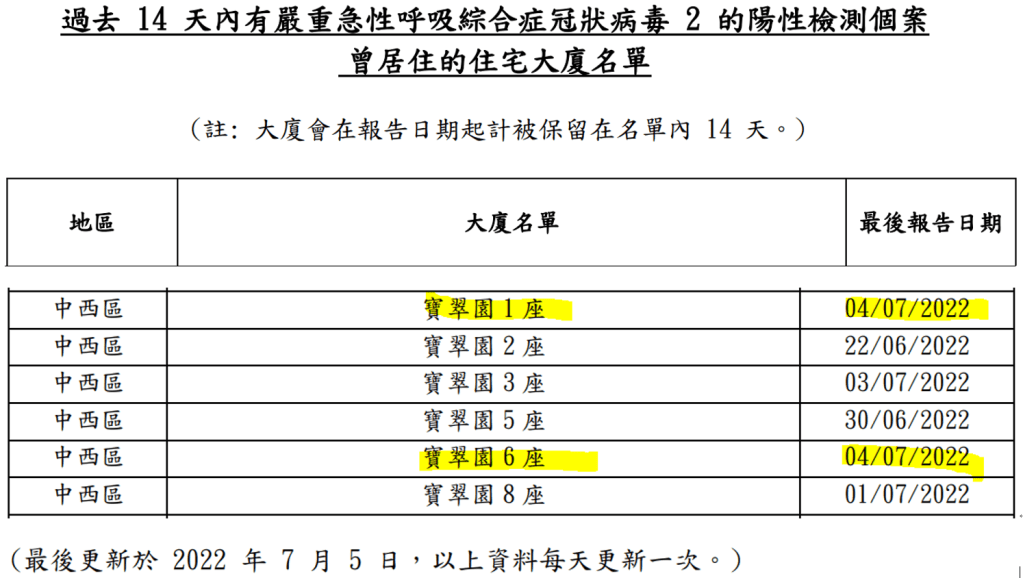 7月5日 2200hrs – 衛生署今天發出有關冠狀病毒陽性檢測個案確診大廈名單 (第及6座有新確診個案)